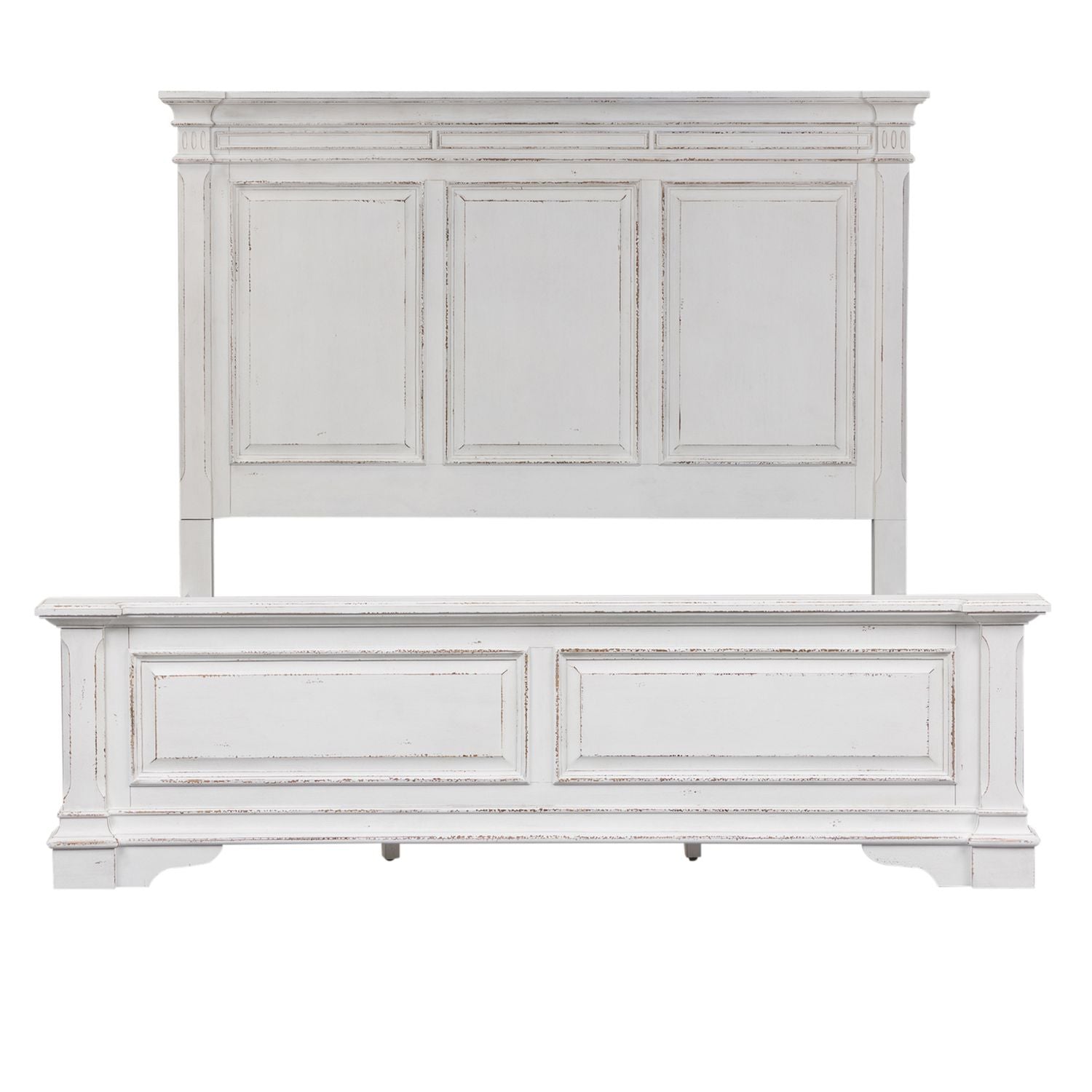 Design possibilities are endless with the Abbey Park California king panel bed, dresser, and mirror. Crafted of poplar solids and cathedral white oak veneers, this kit features an antique white finish with heavy chipping and weathered brown whitewash tops, full extension drawers, premium felt lined top drawers and cedar lined bottom drawers, and is accented with antique pewter bail pull and drop ring hardware. The panel bed features heavy crown molding and raised panel accents framed by bead molding. The dresser has seven drawers and can equip the mirror that features a beveled edge with the included bolt-on supports. The blending of European traditional design influences makes Abbey Park a truly unique style for any living space.