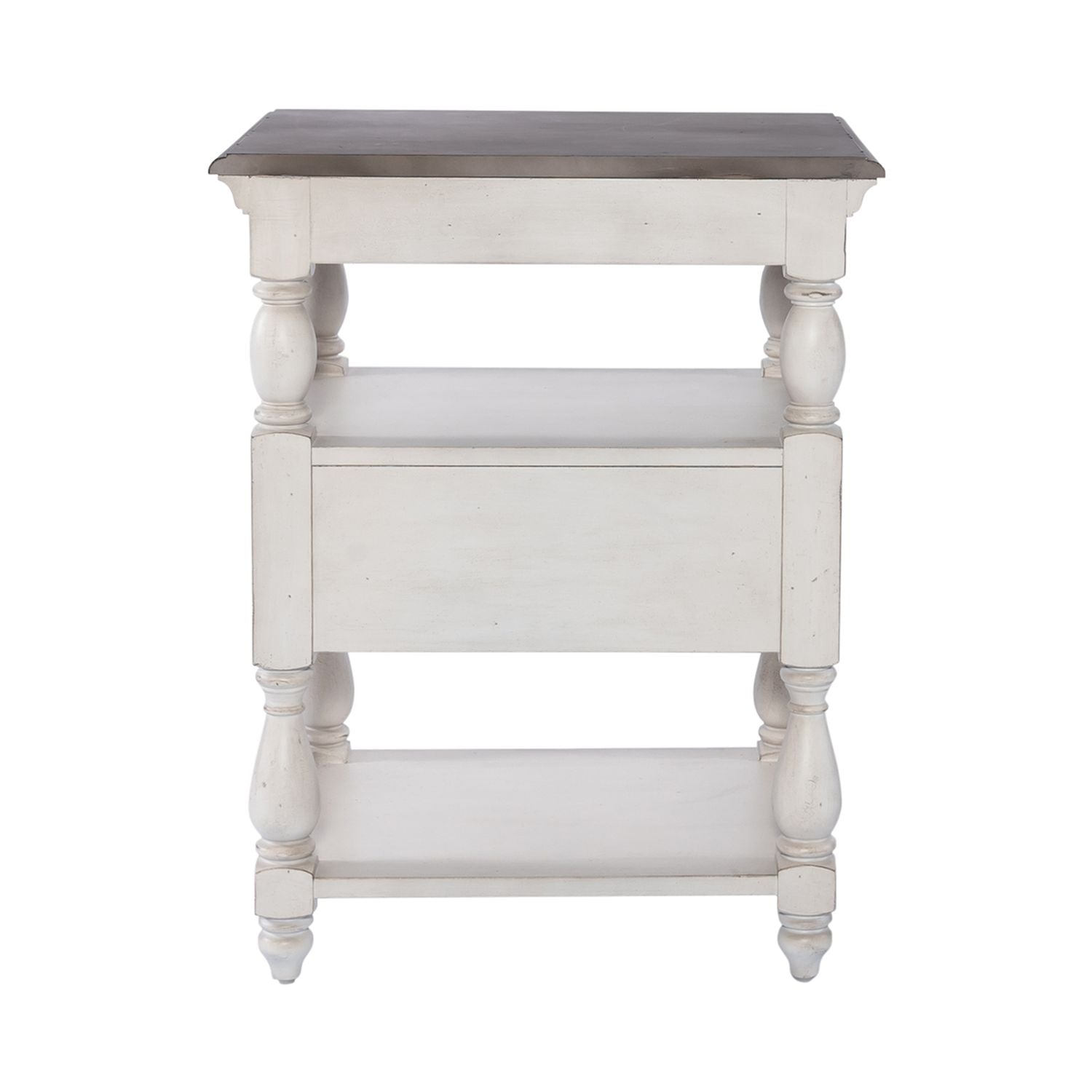 Enhance your space with the Abbey Road drawer end table. Crafted of poplar solids with birch veneers, this piece features a porcelain white finish with a Churchill brown top, two open shelves, one full extension drawer and a pull out shelf for additional storage accented by antique pewter knob hardware, anchored by round turned legs. This unique end table will bring a warm feel to any luxurious antique style space.