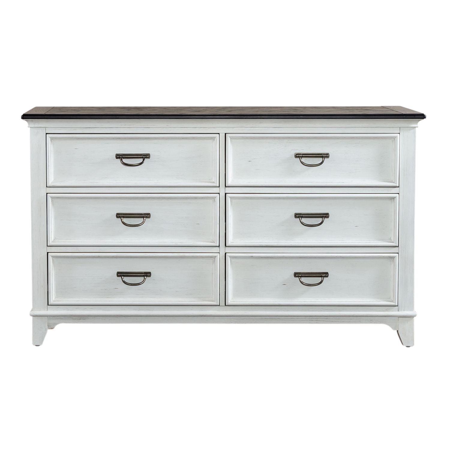 Create a classic cottage style with 6 drawer dresser. The two-toned wire brushed white finish with charcoal top adds a taste of vintage, allowing this piece to work from the mountains to an industrial loft. The charcoal top is accented by planks while the white base is highlighted by bead molding and antique pewter hardware. Crafted of rubberwood solids with cathedral white oak tops, this piece features fully stained interior drawers, full extension drawer glides for easy access to storage, felt lined top drawers, and is anchored by tapered feet. Style uncompromised with storage abound, enjoy the ample drawer storage, each equipped with bottom case dust proofing.