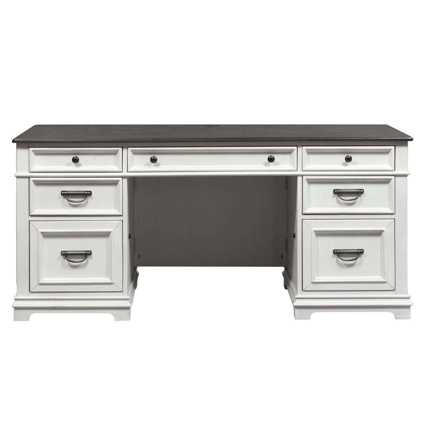 Work from home in comfort and style with this aged cottage Allyson Park Desk. This two-toned piece consists of planked wire brushed charcoal tops, anchored by a solid white base. The desk comes equipped with 2 locking file drawers, flip down keyboard tray and a wire management cut out on the desk top, for user convenience.