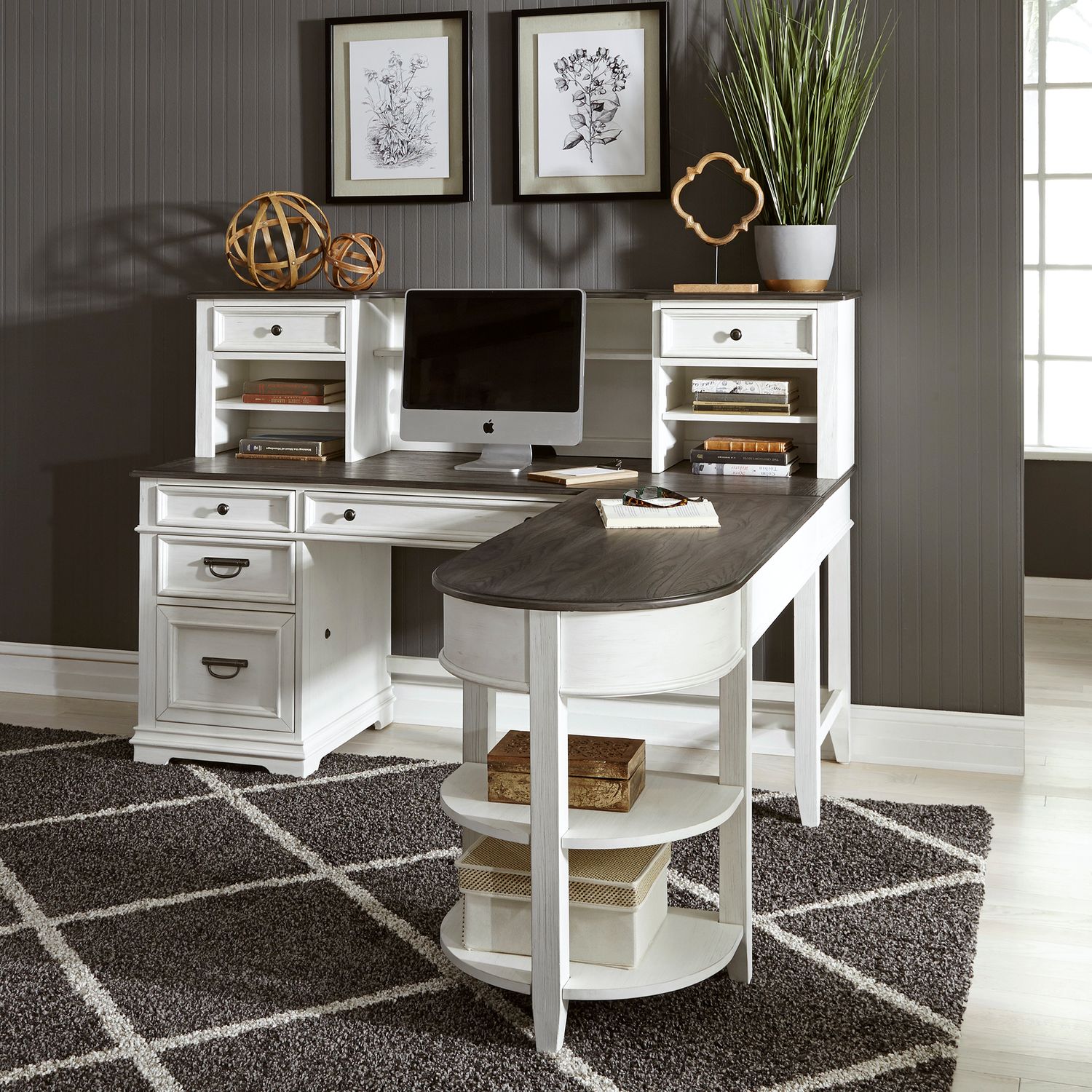 Work from home in comfort and style with the Allyson Park L-shaped desk and hutch. Crafted of pine solids with cathedral white oak tops and pine veneers, this piece features a wire brushed white finish with charcoal tops, full extension drawer glides for easy access to storage, one locking file drawer, bottom case dust proofing to ensure the longevity of contents, 2 flip down keyboard trays for user convenience, built in power supply with two outlets and two USB ports, two open shelves on right return for added storage, and is accented by antique pewter knob and drop bail hardware. The hutch features two drawers and 3 open fixed shelves. With today's modern technology in mind, users can enjoy the convenience of the built-in wire management provisions, keeping your office clean and organized.