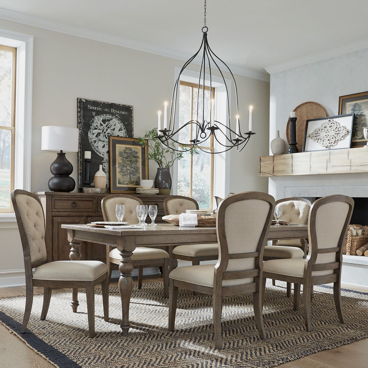 Be distinctively different with the Americana Farmhouse optional seven-piece leg table set. Crafted of poplar and rubberwood solids with white oak veneers, this kit features a wire brushed dusty taupe finish with worm hole distressing and consists of the leg table and six upholstered tufted back side chairs. This table features bead molding on the apron and includes an 18” self-storing leaf anchored by heavy turned legs. The upholstered tufted back chairs feature a gently shaped upholstered tufted back panel with exposed wood framing for a deconstructed feel. The upholstery is highlighted by nail head trim and tapered legs with nylon chair glides to protect your flooring. Americana Farmhouse evokes a style unconstrained and intended to be personal with an authentic craftsman’s flair and artistry.