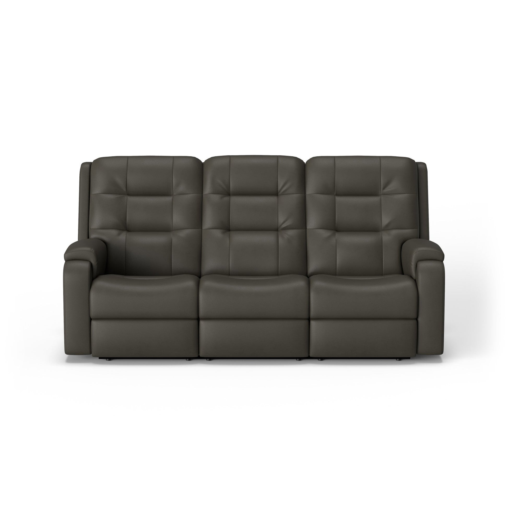Enjoy the look of leather and the feel of high-end ergonomic seating with the Arlo Power Reclining Sofa. Available in more than 50 leather or leather match options, this sofa has a luxurious aesthetic that will last for years to come. To recline, simply touch one of the power controls on either arm. Both feature USB charging ports that will keep devices powered up for streaming or surfing the web. Pull-tufted, triple-divide back cushions bolster your head, neck and lower back, offering a refined look that will elevate the look of your living space. Rounded pad-over track arms support the forearms, while contoured seats with seat chaise pads take pressure off your legs. Top it off with our patented DualFlex Spring System™ that ensures a pleasing mix of flexibility and firmness as you sit, and you’ve got a power reclining sofa that’s built to last.