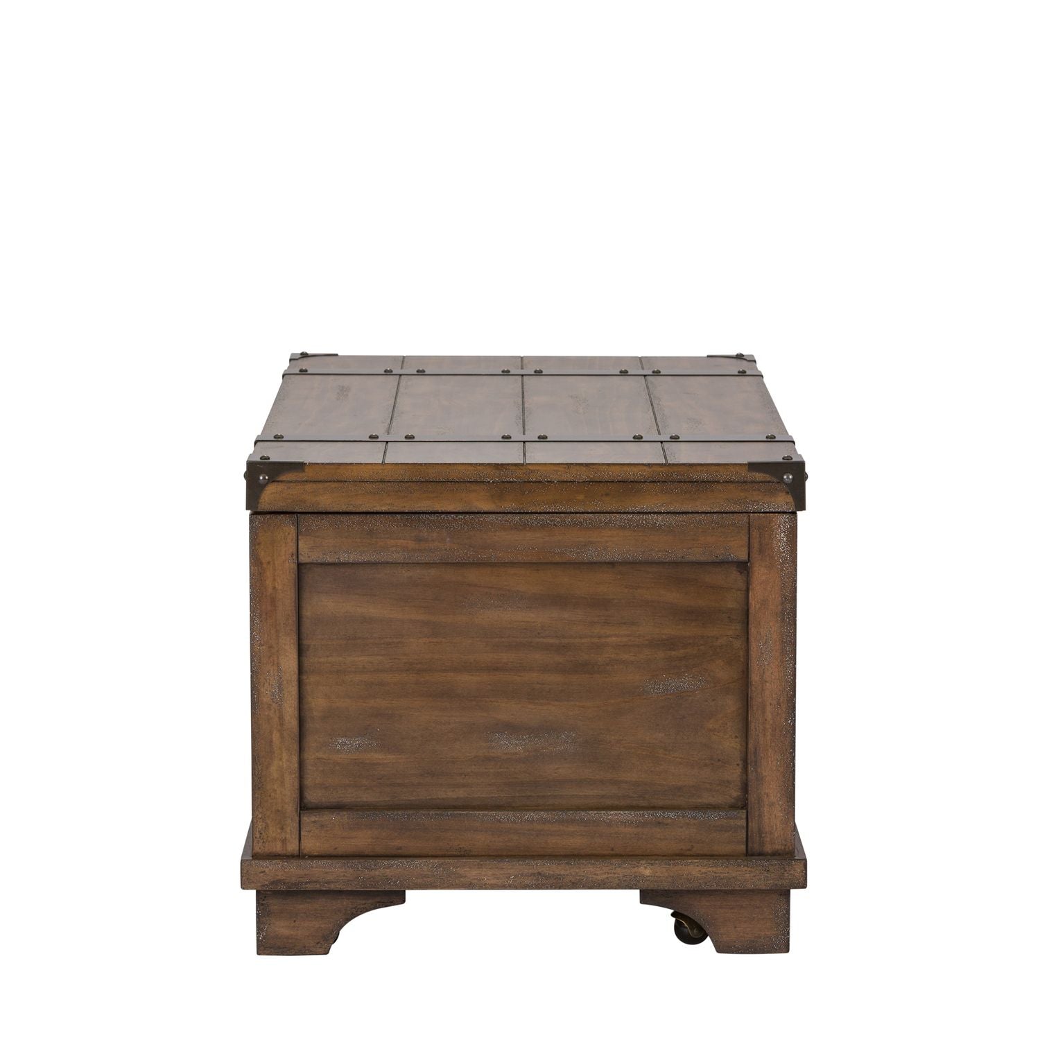 Enhance your space with the traditional Aspen Skies storage trunk. Crafted of pine solids and New Zealand pine veneers with metal accents, this piece features a weathered brown finish with gray hang ups, appealing planked top, corner and body metal strap accents with nail heads, a removable tray for additional storage, anchored by casters and bracket feet and full cedar lining inside the trunk. This traditionally designed storage trunk