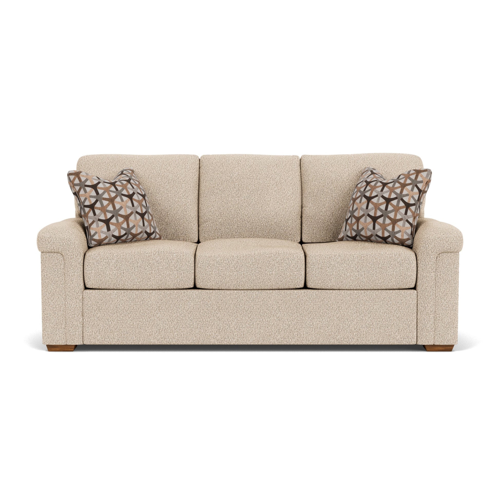 The transitional design of the Blanchard Sofa masters the mix of real style and real life. Ample, well-constructed cushions inspire rest and relaxation. Seat cushions are reversible to preserve cushion shape and extend fabric life. A bold square, tapered block leg offers a modern touch. And two throw pillows add a touch of color.