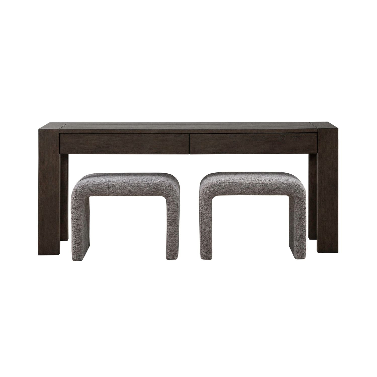 The Cascade Falls 3 piece set is a striking blend of modern elegance and functional design. Crafted with excellence using Rubberwood solids and Split Heart White Oak veneers, this set features a Satin Espresso finish and includes the accent console table and 2 upholstered accent stools. The accent console table features a planked top that adds texture and character to its contemporary silhouette. Standing boldly atop overscale block legs, this console table commands attention with its presence while exuding a sense of stability and sophistication. The wide apron further enhances its clean and streamlined aesthetic, making it a perfect addition to any modern home décor. But it's not just about style – this console table is also designed for practicality. Two storage drawers provide ample space for stowing away essentials, keeping your living area clutter-free and organized. What sets this piece apart is its finger joint pull under each drawer, replacing traditional hardware with a sleek and minimalist touch. The upholstered console stool features a padded seat and is fully upholstered in Grey Mist Boucle fabric. Crafted to perfection, the fully upholstered stool creates a modern silhouette with rounded ends, adding a touch of contemporary flair to any room. Experience the perfect combination of comfort and sophistication with the Cascade Falls 3 piece set. Embrace its sleek silhouette and indulge in moments of relaxation and style.