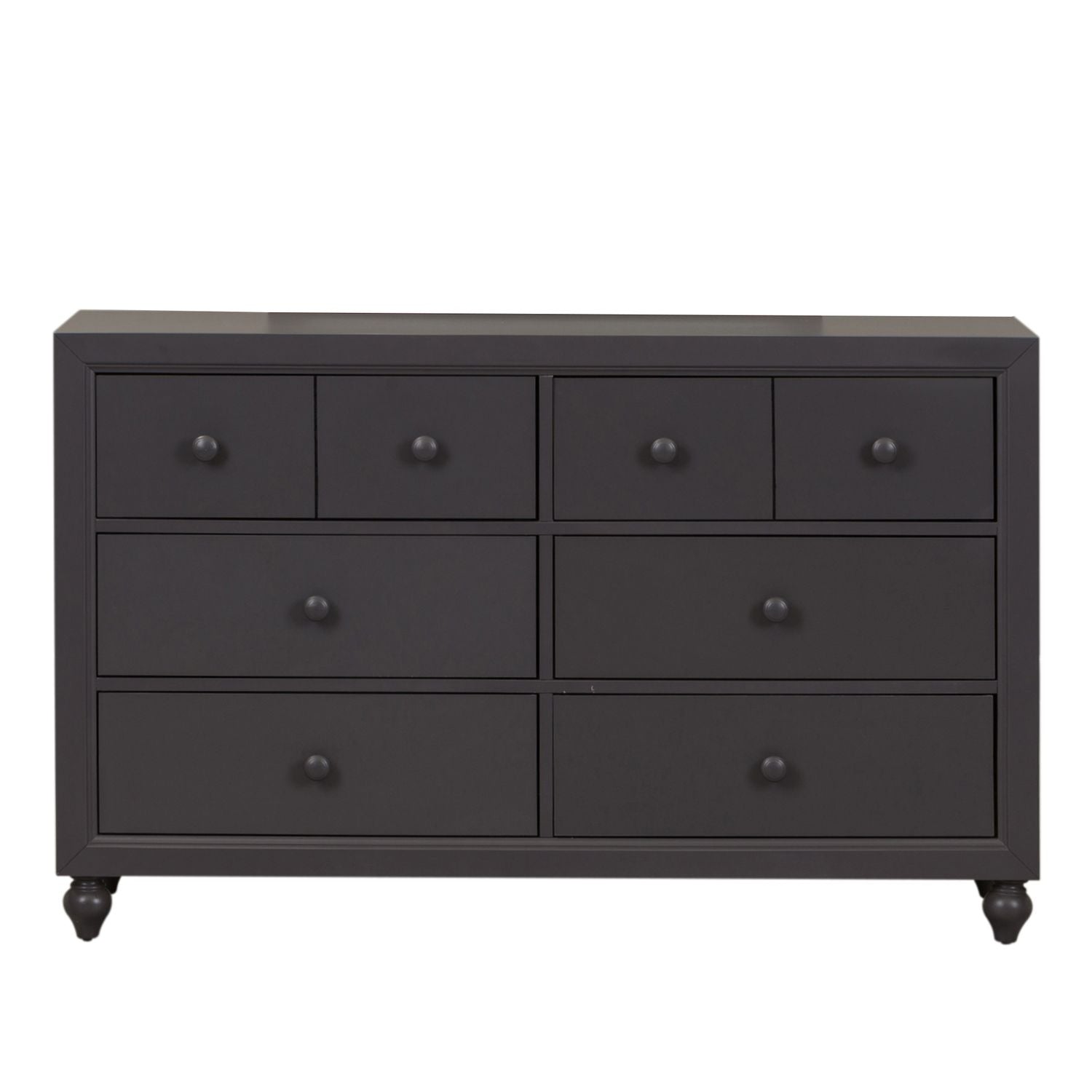 Indulge in cottage design with the Cottage View 6 drawer dresser. Crafted by melamine and a rubberwood solid frame, this piece features a dark grey finish, kenlin drawer glides, bottom case dust proofing, solid wood picture frame moldings, laminate drawer interior, bluff cut top drawers, accented by wooden knob hardware and anchored by bun feet. This piece is offered in an alternate finish, and the melamine is scratch resistant, sure to make this piece last in any home.