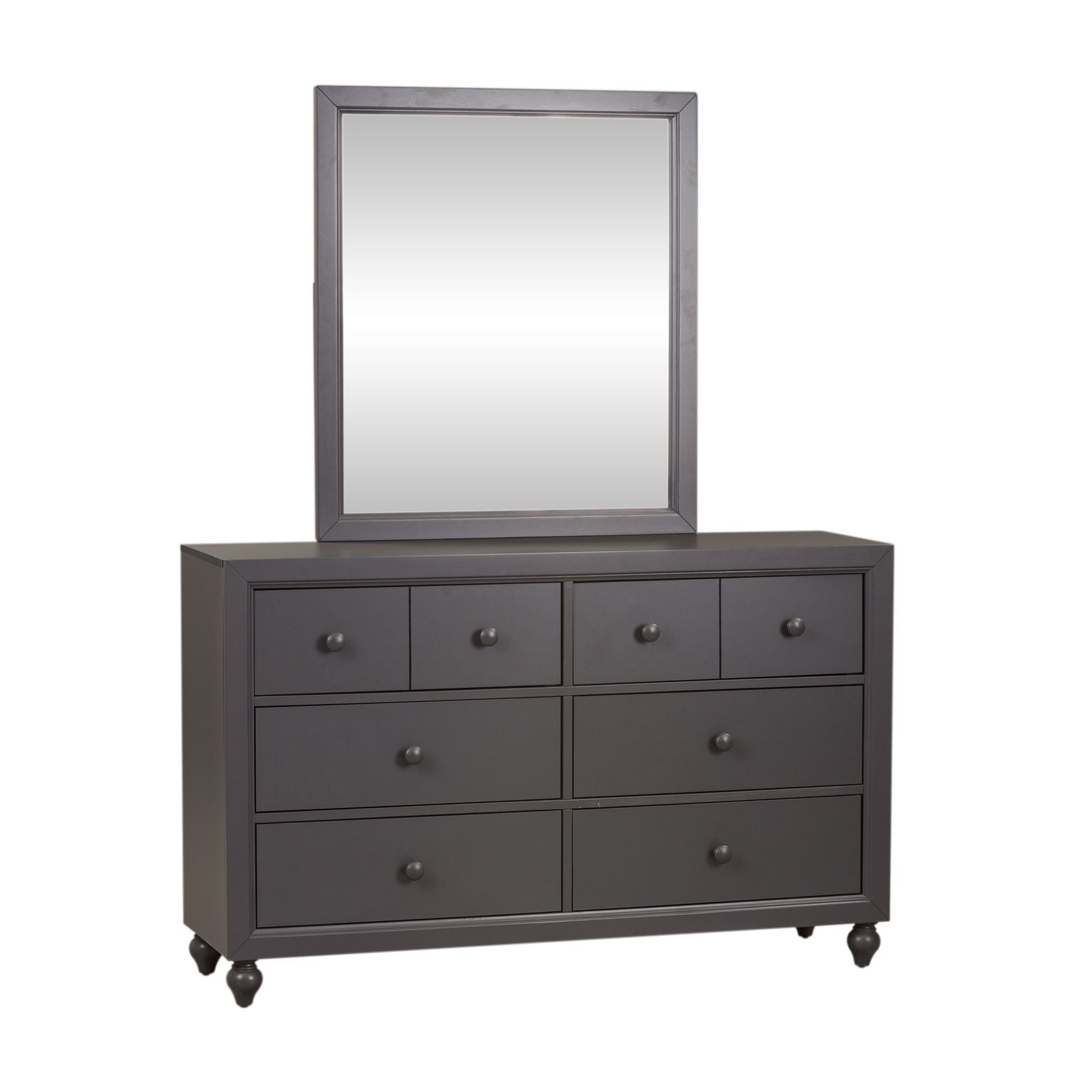Bring in clean lines with the Cottage View full panel bed, dresser, and mirror. Crafted of melamine and rubberwood solids, this kit features a dark gray finish, picture frame solid wood case moldings, bun feet, bluff-cut top drawers, and is accented with wooden knob hardware. The panel bed features square posts with round finials along with slat overlays. The dresser features six drawers and pairs nicely with the beveled edge mirror that can be attached with the included bolt-on supports. With cottage design always in fashion, make the Cottage View a part of your home.