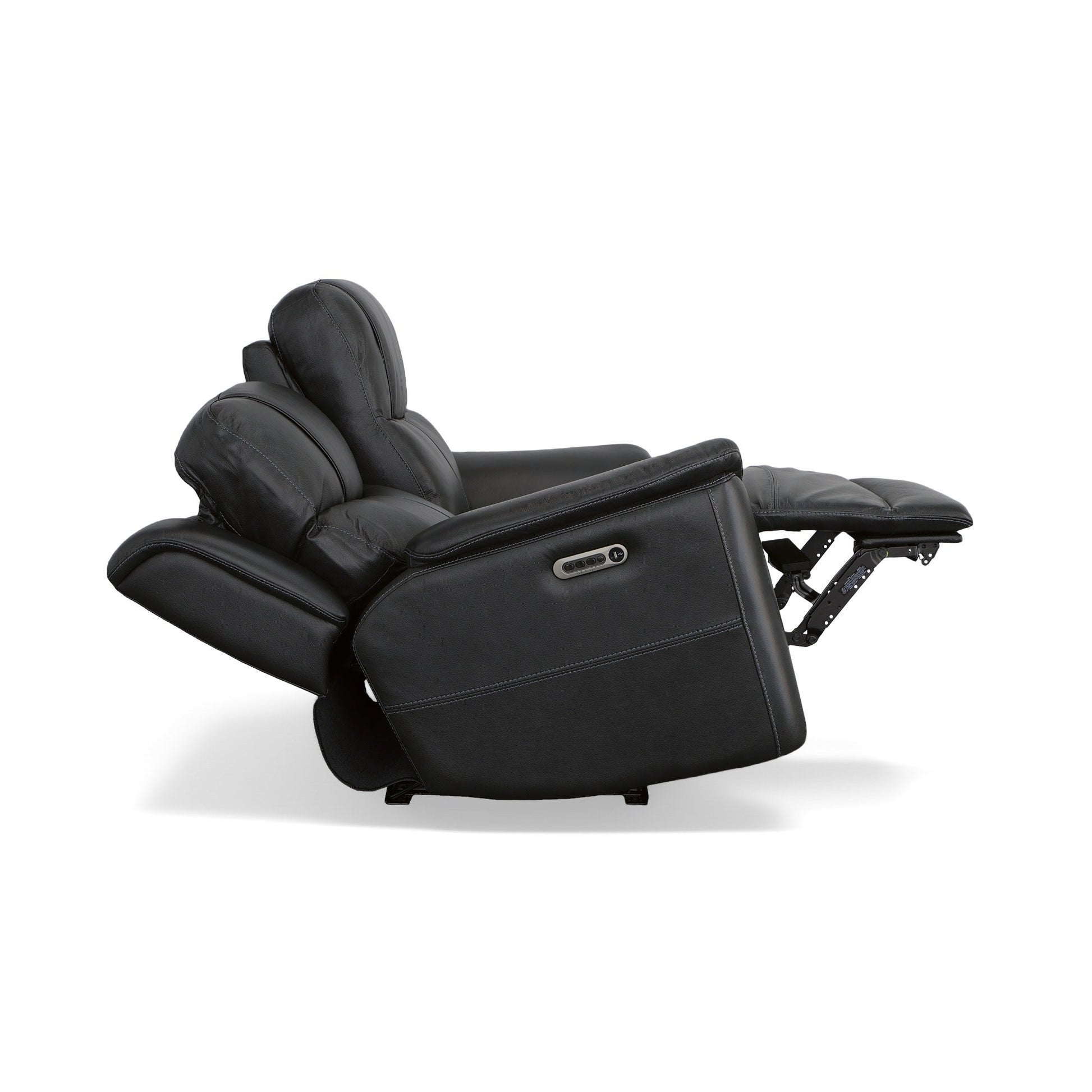 Superior ergonomics combine with the plush comfort of the Crew leather power reclining loveseat. Featuring triple power functionality that allows for independent adjustment of the headrests, lumbar supports and recline, this loveseat also features Zero Gravity which reduces pressure and tension on the body. Enjoy reliable comfort all day, every day, with pad-over armrests, waterfall chaise footrests, thin layered headrests, and divided back cushions. Built-in USB ports conveniently keep mobile devices charged and ready to stream your favorite shows. With Flexsteel's patented Blue Steel Spring™ at the heart of each seat, and high-quality raven black leather, the Crew power reclining loveseat brings exceptional beauty and durability to your home.