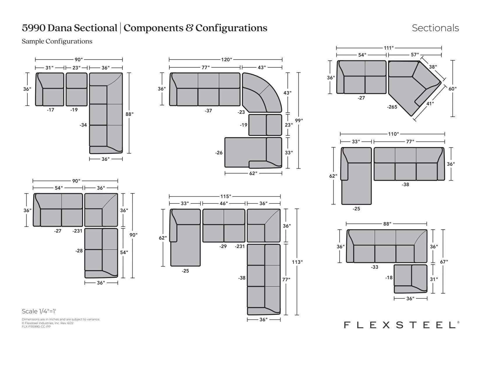 Simply tailored with classic details Dana is current and stylish, yet simple enough to withstand the test of time. This modestly scaled style is a great option for small spaces. With a tightly padded back, tailored roll arms and tall tapered feet, Dana fits classic touches into a streamlined design that lends openness to any space. Multiple sectional components provide countless configurations to fit any room's shape and scale. Model Number: 5990-SECT Dimensions