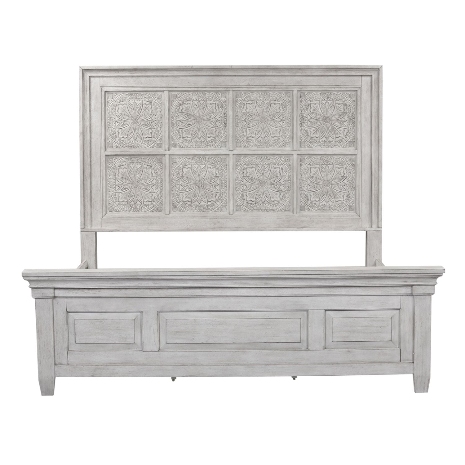 Elevate your farmhouse style home with the Heartland optional king panel bed, dresser, and mirror. Crafted of rubberwood solids with cathedral white oak and birch veneers, this kit features an antique white finish with tobacco tops, planked tops and end panels, full extension drawers with premium felt lining in the top drawers and cedar lining in the bottom drawers, wood framed drawer fronts, and is accented with antique brass knob hardware. This optional panel bed features beautiful antique ceiling tile panels, heavy top crown molding and raised panels on the footboard. The dresser offers optimal storage with nine drawers including a unique bluff-cut top center drawer. Pair the landscape mirror with this dresser, that offers a beveled edge and bead molding, and is anchored by bolt-on supports. Add this one-of-a-kind bedroom kit to your beautiful home.