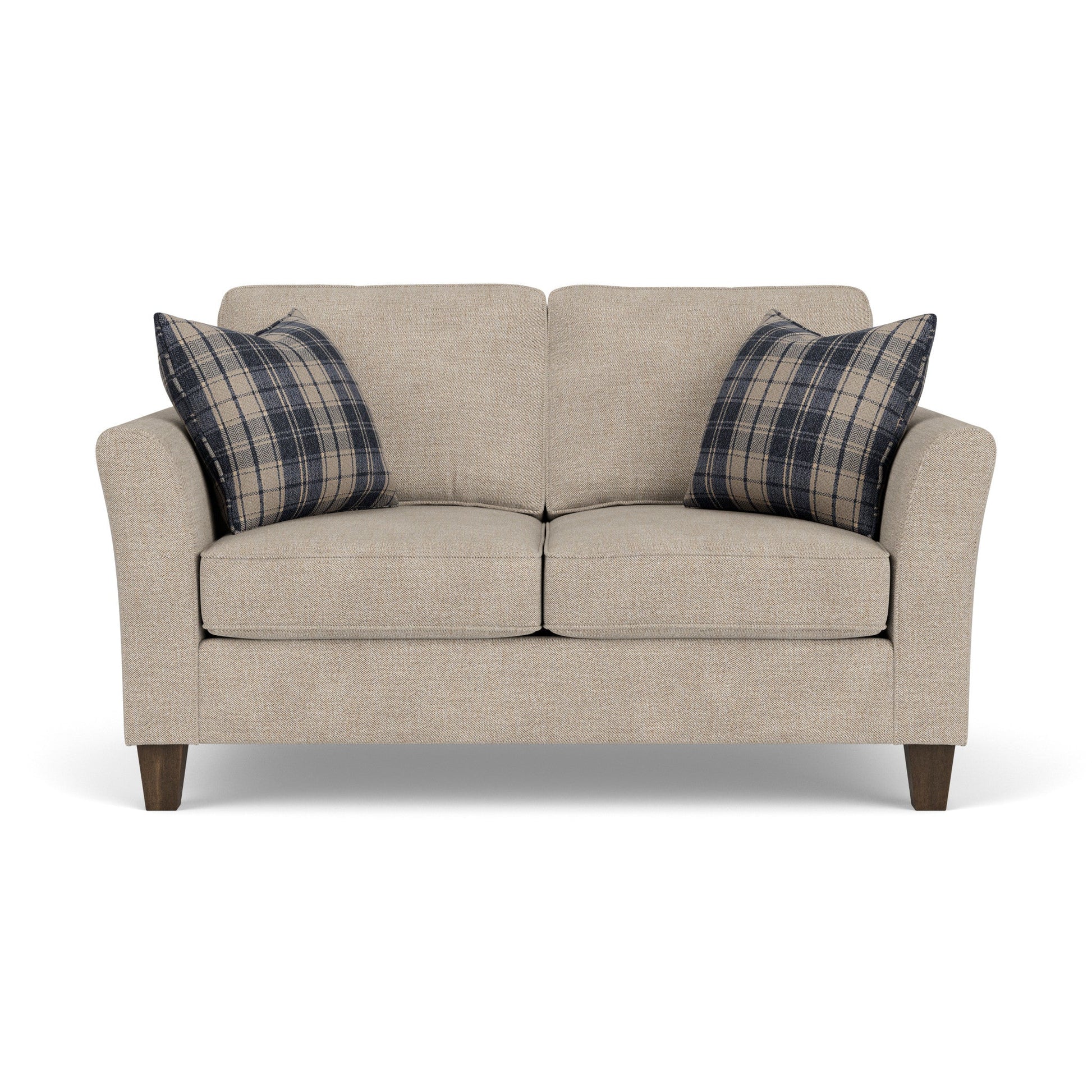 Libby is a transitional stationary style with clean lines and graceful curves. Its off-the-floor frame is complimented by square tapered legs. This loveseat features an elegant roll arm with a detailed welt trim. Two square accent throw pillows are provided. The posh and plush style of Libby fits in with many home décor spaces.