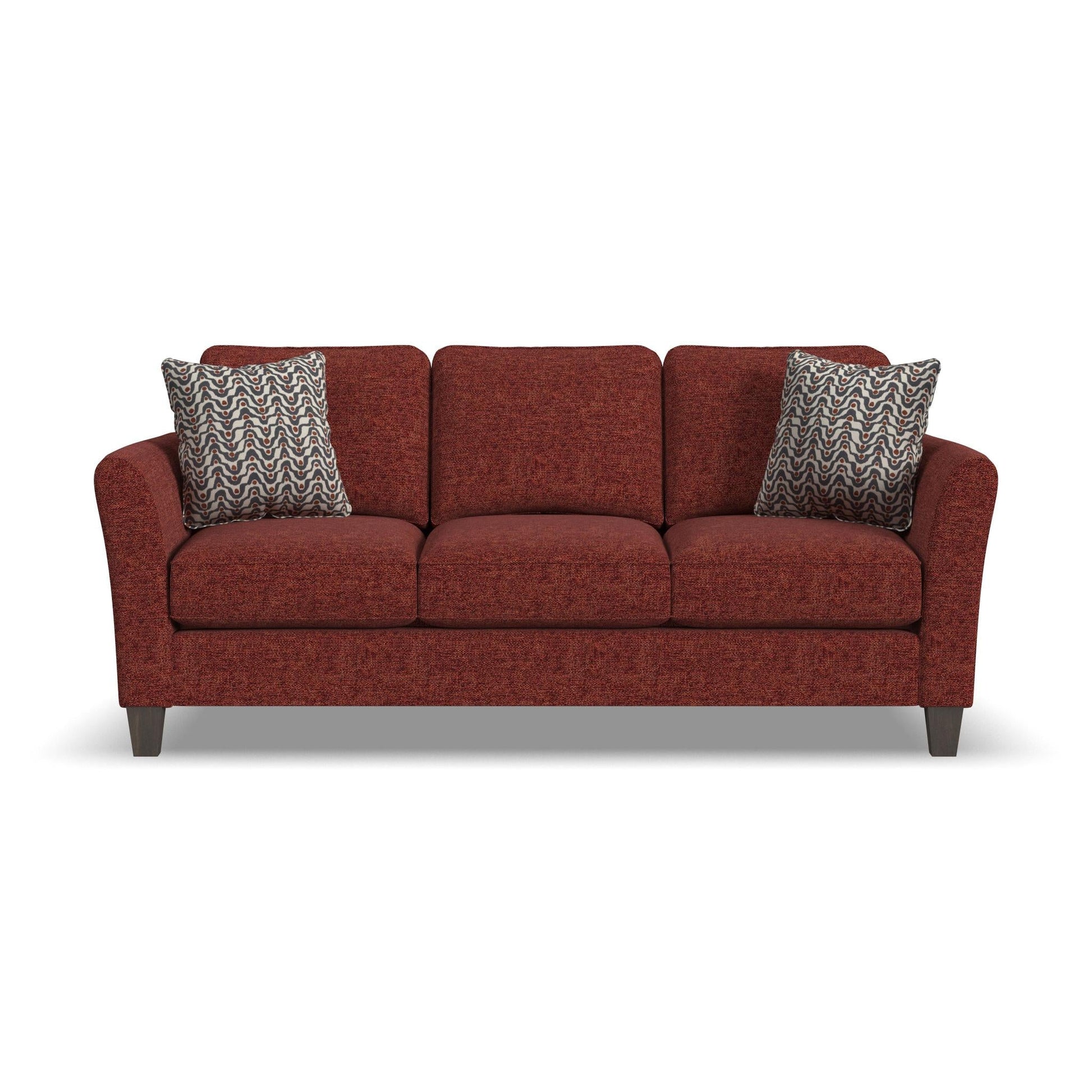 Libby is a transitional stationary style with clean lines and graceful curves. Its off-the-floor frame is complimented by square tapered legs. This sofa features an elegant roll arm with a detailed welt trim. Two square accent throw pillows are provided. The posh and plush style of Libby fits in with many home décor spaces.