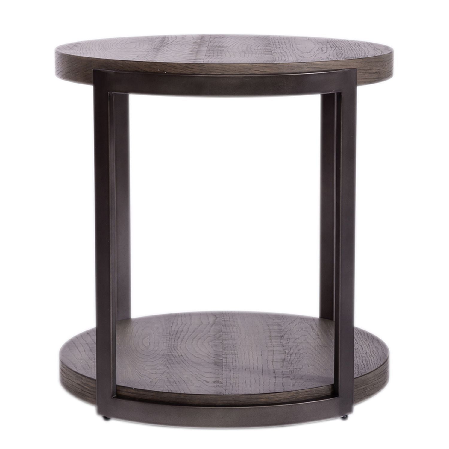 Design possibilities are endless with the Modern View round cocktail table and two end tables. Crafted of metal with split heart oak veneers, this kit features a gauntlet gray finish. The cocktail table and end tables feature wire brush distressing, dark pewter metal bases, open shelf design, and casters added to the cocktail table for easy maneuverability. Add this one-of-a-kind kit to your modern styled home.