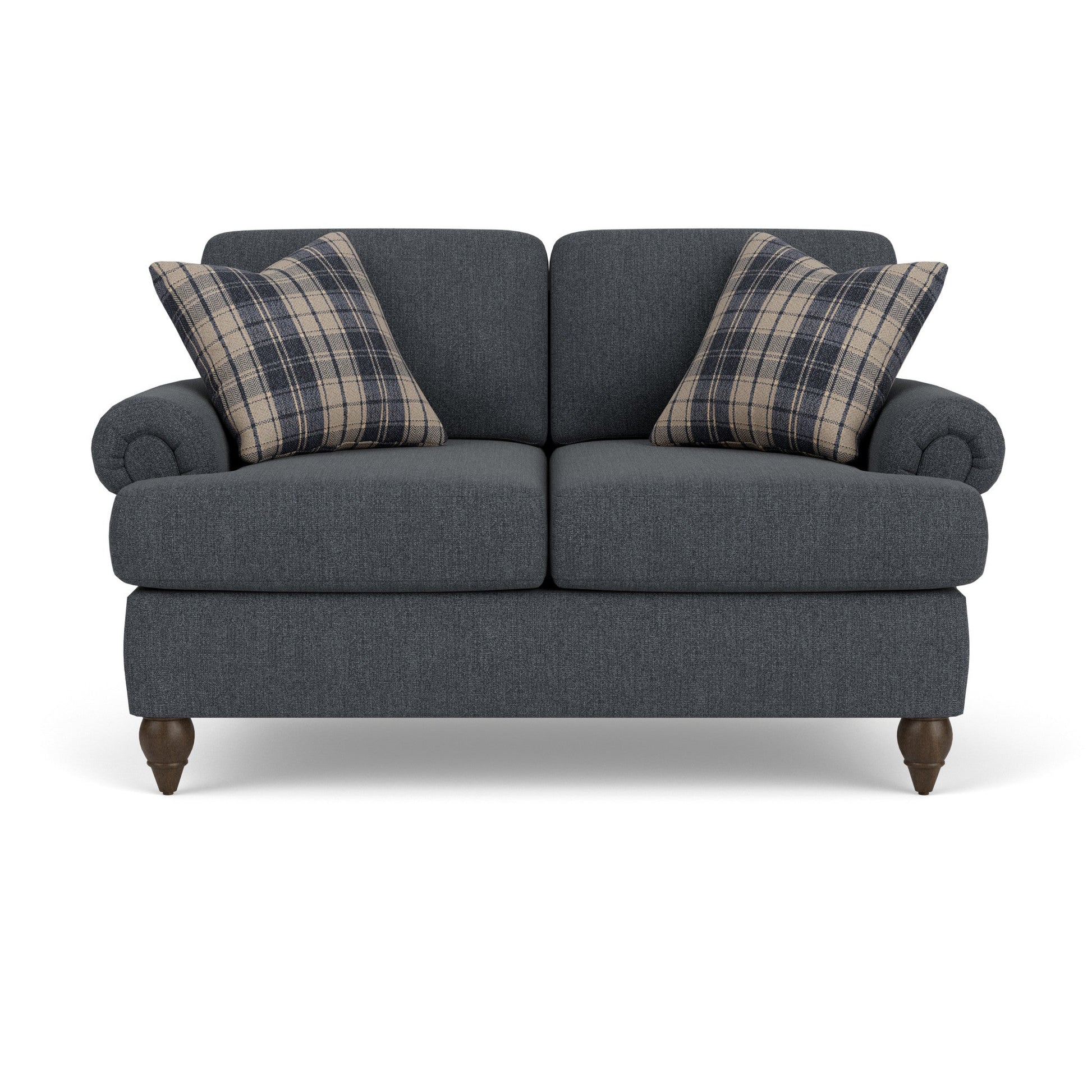 Spirit Meets Style Cozy up with a loved one or claim it all for yourself with the Moxy loveseat that lets you personalize details for the perfect look and feel. Formal panel roll arms sit on round turned legs that are available in a choice of three distinct wood finishes—Florentine, Valencia, or Urban Renewal—to complement any décor. The removable T-shaped seat cushions offer a distinctive look and added comfort. Sink into the ideal level of support with your choice of our luxury or plush cushions. Complete the look and showcase your lifestyle with hundreds of different fabric choices, including high-performance and sustainable textiles. Superior frame construction and our patented C-Flex Blue Steel Spring™ ensures your Moxy can be enjoyed for years to come. Formal panel roll arm style Off-the-floor round turned leg come in Valencia, Florentine, or Urban Renewal finishes Semi-attached back cushions remain fixed in place, ensuring a clean look and comfortable feel Removable seat cushions in a distinctive T-shaped style Sit comfortably with luxury cushions featuring a moderately firm polyurethane foam core wrapped with a soft fiber wrap, or select plush cushions featuring a high-resiliency polyurethane foam core wrapped with a soft fiber wrap for added support Built to last with the Flexsteel patented C-Flex Blue Steel Spring™ that provides an elevated level of support Available in hundreds of fabric choices, including those with robust performance and sustainability characteristics Comes with two accent pillows to enhance comfort and style Model Number: 5018-20 Dimensions 37H x 62W x 39L