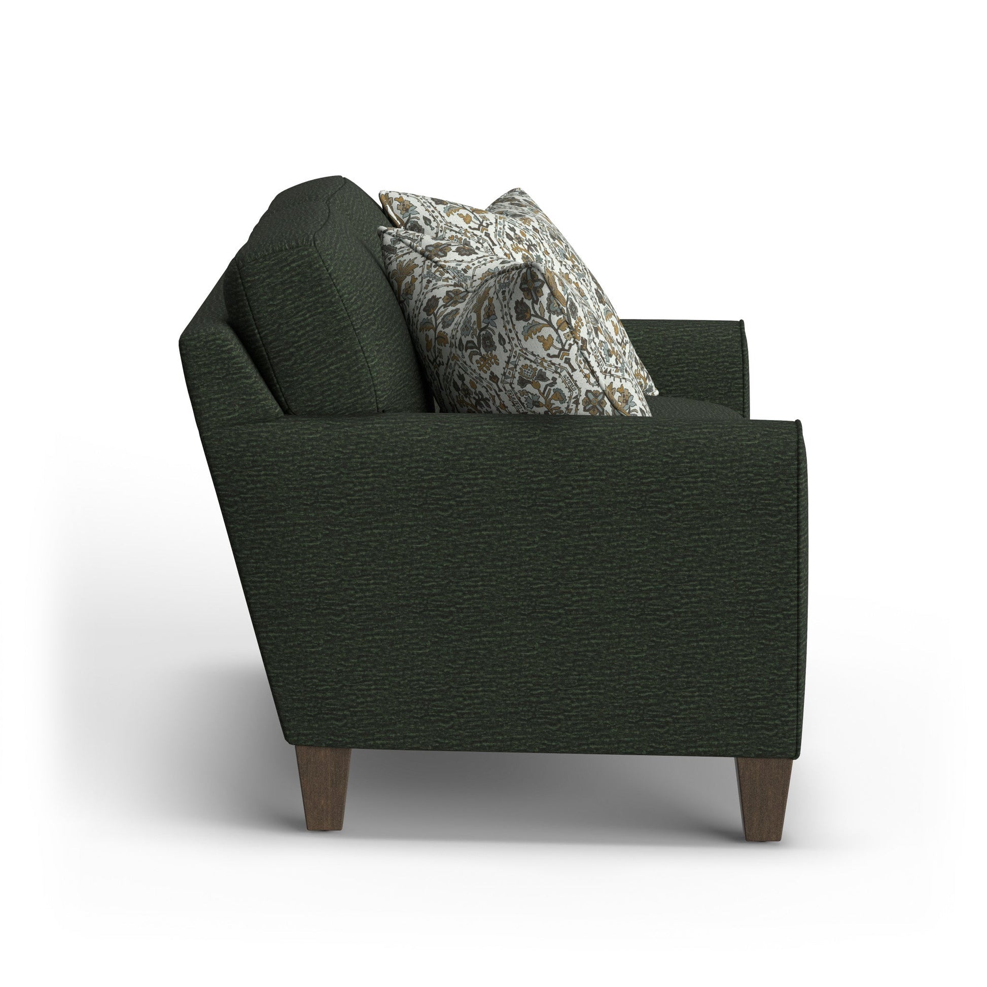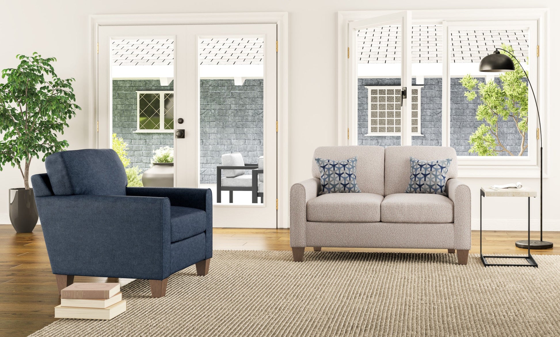 Spirit Meets Style Cozy up with a loved one or claim it all for yourself with the Moxy loveseat that lets you personalize details for the perfect look and feel. Rounded mailbox arms provide a clean look. Square tapered legs come in your choice of three distinct wood finishes—Florentine, Valencia, or Urban Renewal—to complement any décor. The removable square, inside seat cushion style offers you the flexibility to rotate for added longevity. Sink into the ideal level of support with your choice of our luxury or plush cushions. Complete the look and showcase your lifestyle with hundreds of different fabric choices, including high-performance and sustainable textiles. Superior frame construction and our patented C-Flex Blue Steel Spring™ ensures your Moxy can be enjoyed for years to come. Rounded mailbox arms provide a contemporary look Off-the-floor square tapered legs come in Valencia, Florentine, or Urban Renewal finishes Semi-attached back cushions remain fixed in place, ensuring a clean look and comfortable feel Removable seat cushions in a classic square style Sit comfortably with luxury cushions featuring a moderately firm polyurethane foam core wrapped with a soft fiber wrap, or select plush cushions featuring a high-resiliency polyurethane foam core wrapped with a soft fiber wrap for added support Built to last with the Flexsteel patented C-Flex Blue Steel Spring™ that provides an elevated level of support Available in hundreds of fabric choices, including those with robust performance and sustainability characteristics Comes with two accent pillows to enhance comfort and style Model Number: 5039-20 Dimensions 37H x 58W x 39L