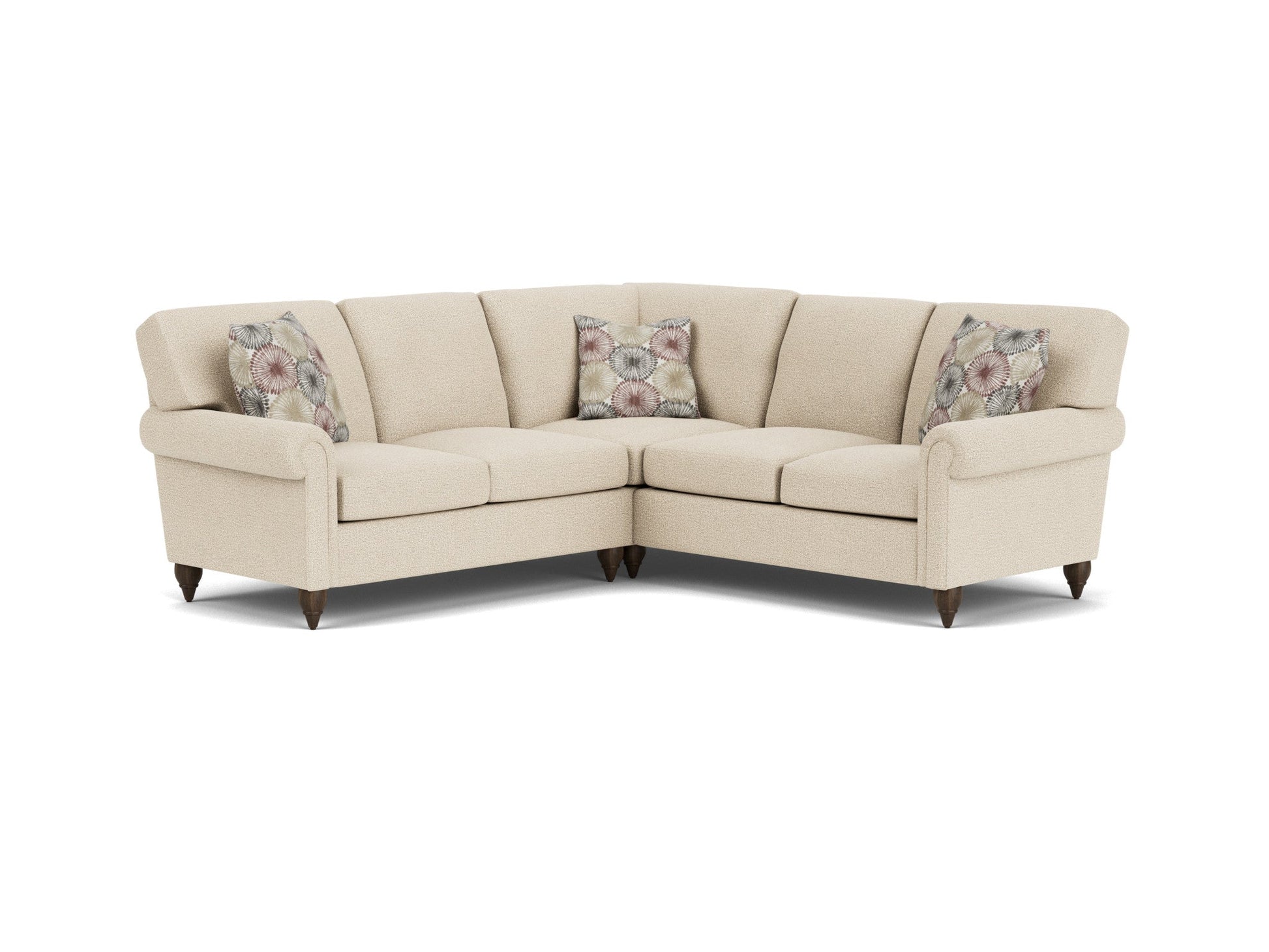 Spirit Meets Style Cozy up with the family or claim it all for yourself with the Moxy sectional that lets you personalize details for the perfect look and feel. Formal panel roll arms sit on round turned legs for a traditional look. This sectional is built with superior frame construction and our patented Blue Steel Spring, ensuring your Moxy can be enjoyed for years to come. Create a custom configuration just for your home with five components to choose from. Then, complete the look and showcase your lifestyle with hundreds of different fabric choices, including high-performance and sustainable textiles. Choose from five sectional components to build a custom configuration Formal panel roll arm style and round turned legs provide a traditional look Semi-attached back cushions remain fixed in place, ensuring a clean look and comfortable feel Removable seat cushions in a classic square style Built to last with the Flexsteel patented C-Flex Blue Steel Spring that provides an elevated level of support Available in hundreds of fabric choices, including those with robust performance and sustainability characteristics Comes with accent pillows to enhance comfort and style Model Number: 5038-SECT Dimensions