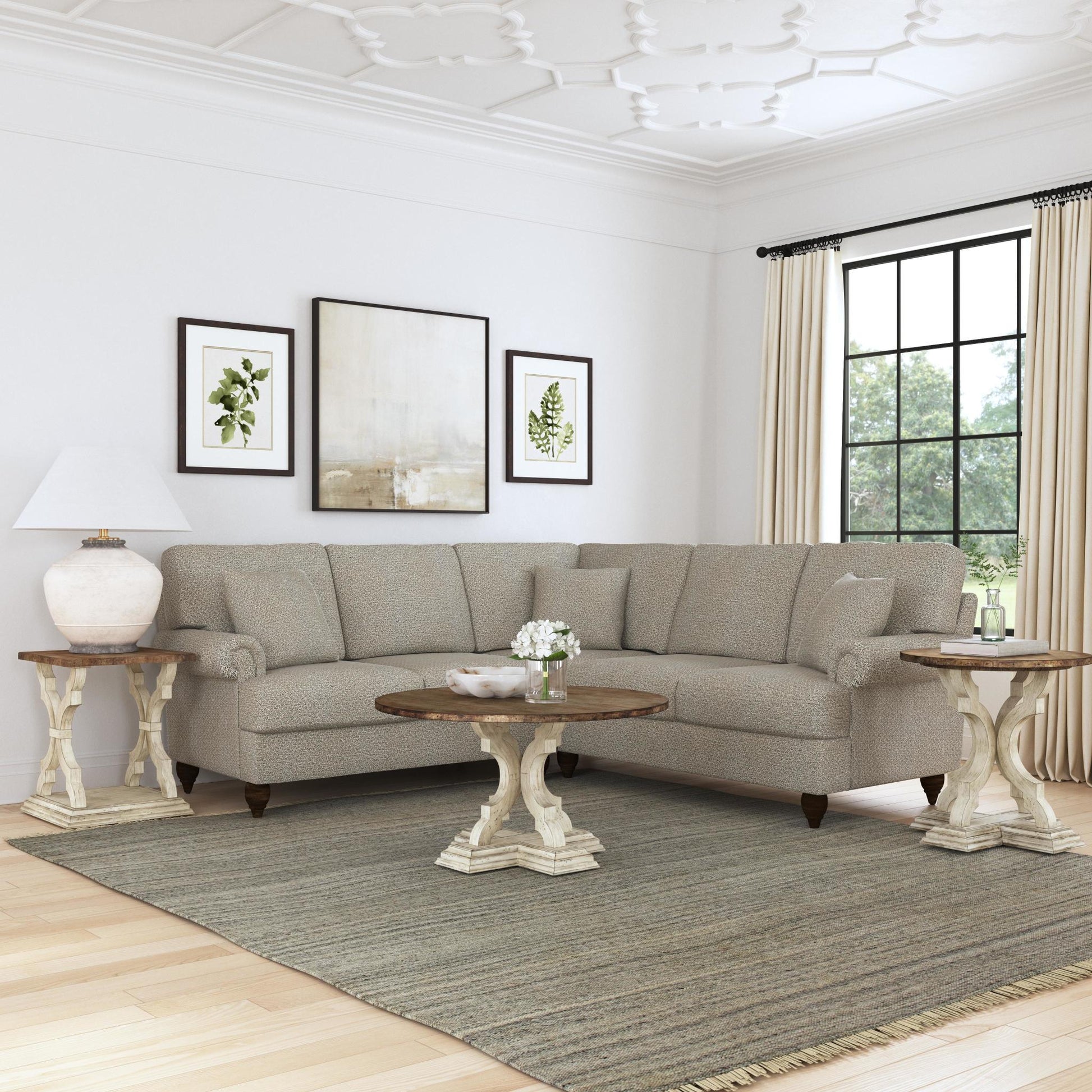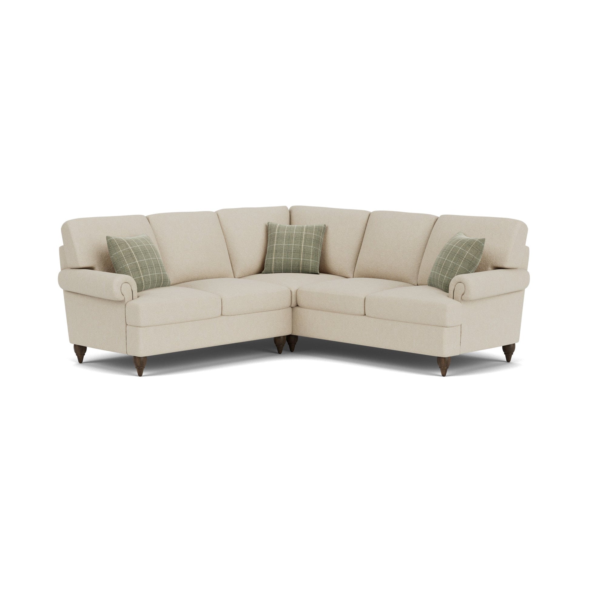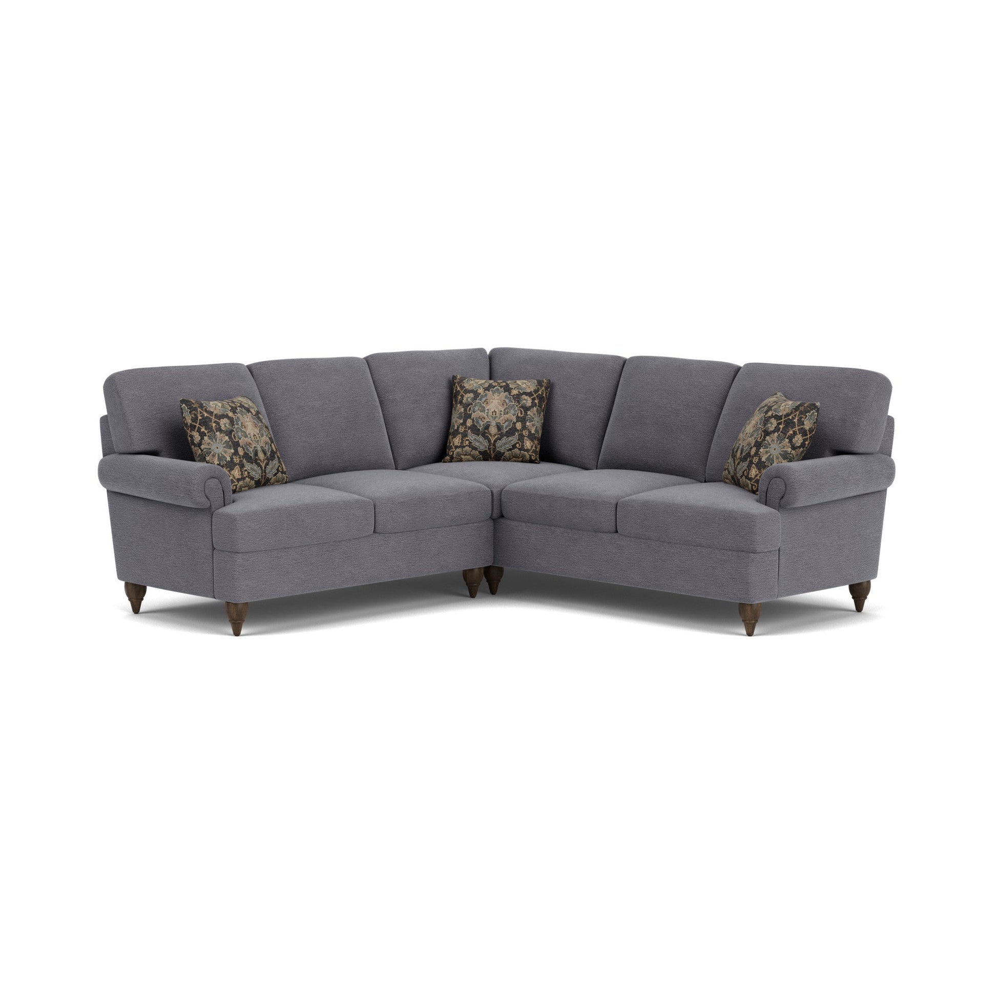 Spirit Meets Style Cozy up with the family or claim it all for yourself with the Moxy sectional that lets you personalize details for the perfect look and feel. Formal panel roll arms sit on round turned legs for a traditional look. This sectional is built with superior frame construction and our patented Blue Steel Spring, ensuring your Moxy can be enjoyed for years to come. Create a custom configuration just for your home with five components to choose from. Then, complete the look and showcase your lifestyle with hundreds of different fabric choices, including high-performance and sustainable textiles. Choose from five sectional components to build a custom configuration Formal panel roll arm style and round turned legs provide a traditional look Semi-attached back cushions remain fixed in place, ensuring a clean look and comfortable feel Removable seat cushions in a distinctive T-shaped style Built to last with the Flexsteel patented C-Flex Blue Steel Spring that provides an elevated level of support Available in hundreds of fabric choices, including those with robust performance and sustainability characteristics Comes with accent pillows to enhance comfort and style Model Number: 5018-SECT Dimensions