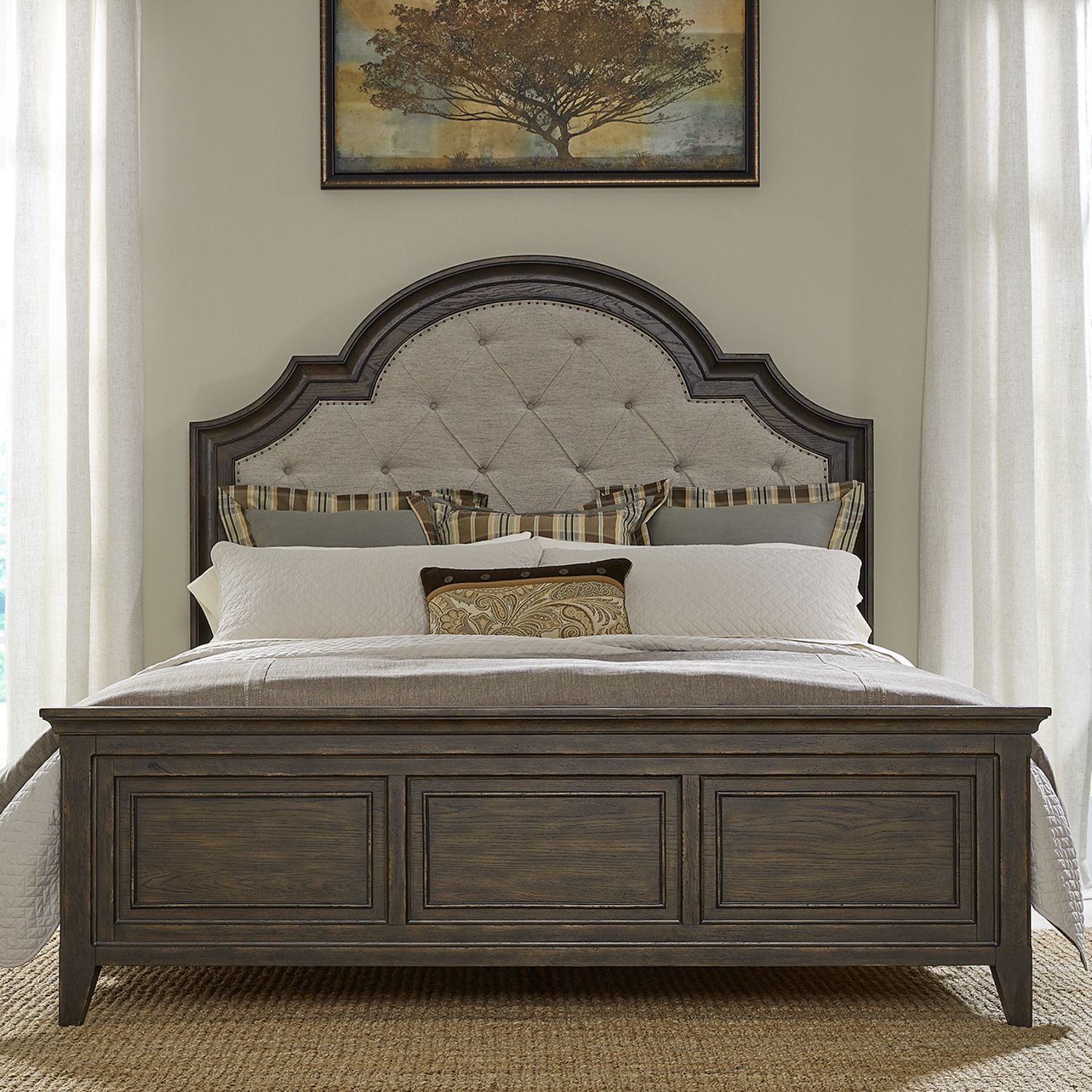 Built for beauty, strength, and durability, the Paradise Valley King Upholstered bed was designed to last throughout the years and delight generations to come. Crafted with excellence using Rubberwood solids and Split Heart White Oak veneers, this bed features a Saddle Brown finish. The arched crown and sloped sides with chamfered pilasters on the headboard create beautiful shaping. The wood framed button tufted upholstered panel in a Flax Tweed fabric is accented by an Antique Pewter nail head trim. Framed panels trimmed with bead molding create a stunning accent to the panel footboard. Chamfered pilasters flow into square tapered feet. Heavy crown molding adds to the traditional feel and captures grand opulence with comfortable rustic styling.