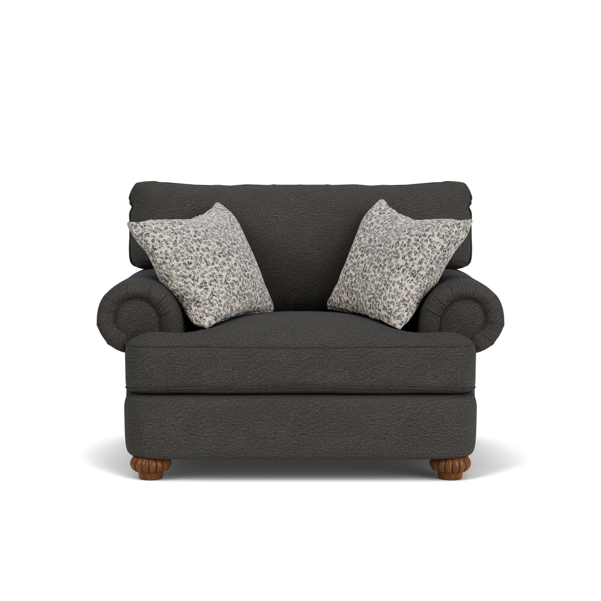 Prominently rolled arms and a padded front rail give Patterson its welcoming appearance. Overstuffed seat and back cushions on a large frame make it difficult to resist curling up on this piece. Fluted bun feet and optional nailhead trim add the finishing touches to Patterson.
