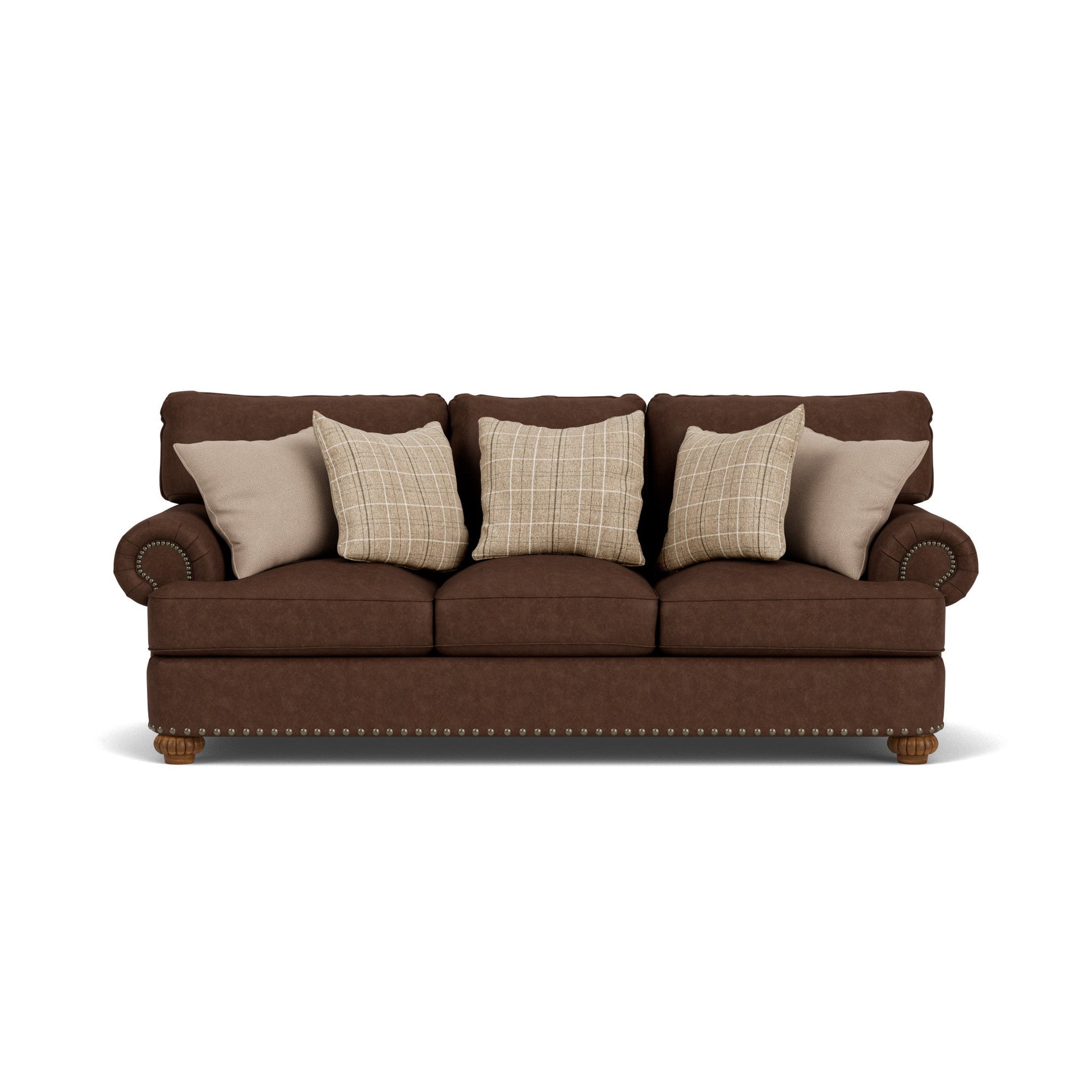 Generous proportions in an elegant design Prominently rolled arms and a padded front rail give Patterson its welcoming appearance. Overstuffed seat and back cushions on a large frame make it difficult to resist curling up on this piece. Fluted bun feet and optional nailhead trim add the finishing touches to Patterson. Dimensions 40H x 96W x 42L