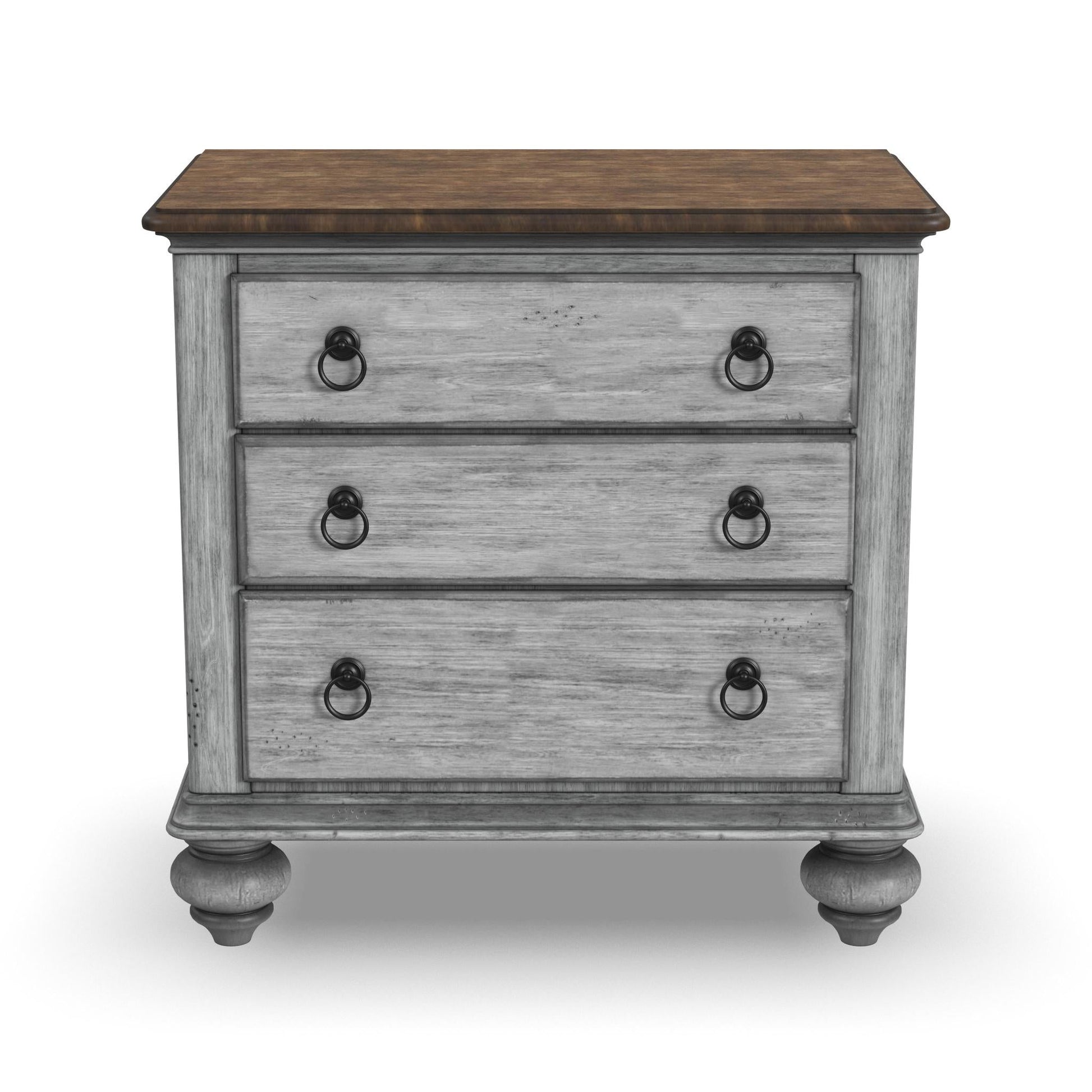 Vintage cottage style meets modern convenience with the Plymouth nightstand. Outfitted with three roomy drawers on premium ball-bearing glides to store all your bedside essentials, this nightstand also features integrated power to keep unsightly cords concealed and USB ports to charge your devices. A distressed graywash finish is contrasted with antique gunmetal pulls, while paneled accents and turned bun feet add to the unique vintage charm.