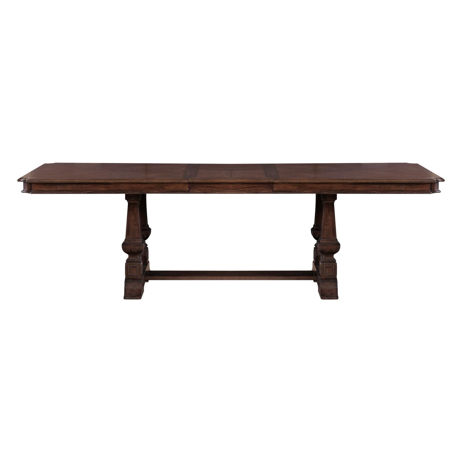 The Provence Park trestle table is a masterpiece of innovation and design that transcends the ordinary, redefining your dining experience with a perfect blend of style and functionality. Meticulously crafted using Rubberwood solids and Split Heart Hickory veneers, this table features a Chateau Brown finish. The star of this table is its self-storing 20-inch leaf, effortlessly integrated into the design on an easy glide leaf track system. Expand your dining space with ease, adapting to the evolving needs of your gatherings. The fancy face veneer top of the table showcases the meticulous craftsmanship, offering a visually striking surface that becomes a centerpiece in any dining room. The concave corners and bead molding accents add a layer of refinement, creating a table that is as elegant as it is practical. Each pedestal features two square turned legs adorned with a scrolled X-shaped poly resin accent, meticulously painted to resemble metal. The double pedestals, boasting shaped bracket feet, provide a sturdy foundation for the table. Connected by a center trestle, the design not only reinforces stability but also adds a sense of balance and symmetry to the piece. Elevate your dining experience with the Provence Park trestle table.