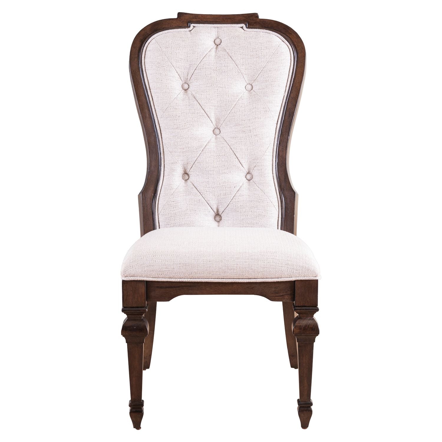 Get the perfect harmony of design and comfort that brings a touch of elegance to your dining space with the Provence Park upholstered side chair. Meticulously crafted using Rubberwood solids, this chair features a Chateau Brown finish. The standout feature of this chair is its shaped wood-framed upholstered back and seat, adorned with button-tufted cream textured chenille upholstery. This meticulous detailing not only adds visual interest but also provides a plush and inviting surface for ultimate relaxation. The button tufting creates a captivating pattern, enhancing the overall richness of the chair's design. The square turned tapered legs, featuring bead molding, showcase meticulous craftsmanship and add a timeless charm to the chair's design. Nylon chair glides are thoughtfully included to protect your flooring, ensuring that your investment in this chair extends to the preservation of your home. Whether you're hosting a formal dinner or enjoying a casual meal, the Provence Park upholstered side chair offers both style and comfort in equal measure.