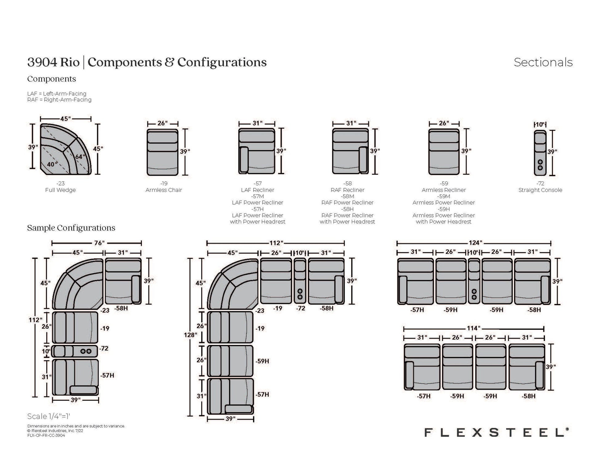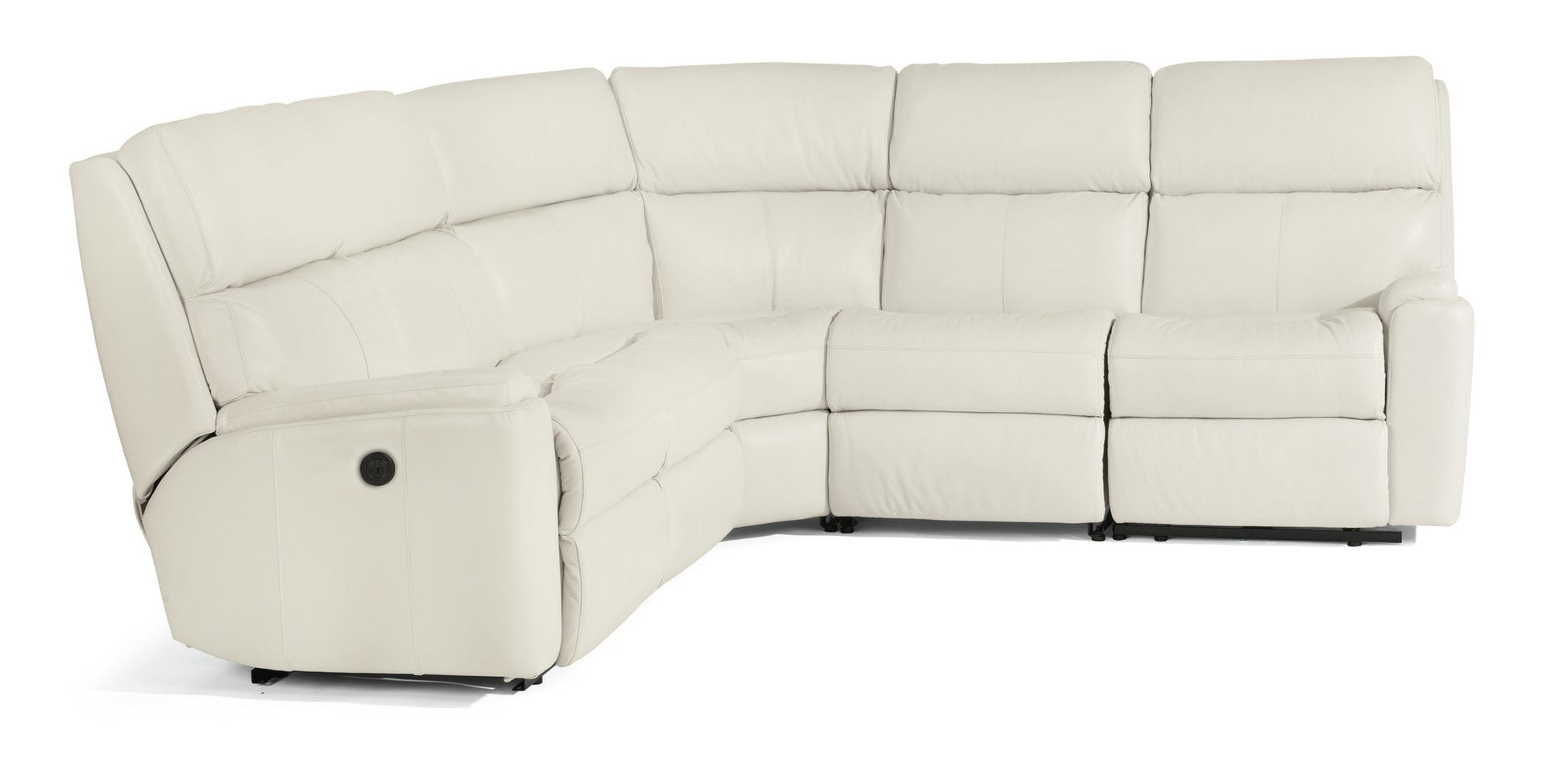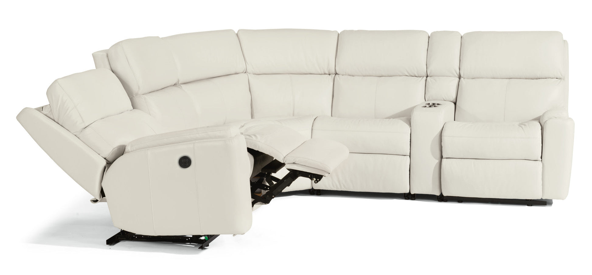 Gather everyone together for a comfortable night in with the Rio Power Reclining Sectional, available in our premium leather upholstery. Using the power controls in either arm, everyone can prop up their feet to lay back to relax. USB charging ports in the power controls give you a place to charge devices, while remotes and beverages can be kept handy in a convenient storage console. Design details including divided back cushions support your neck, back and lower lumbar, while inset padded armrests take pressure off your forearms. Durability is never an issue thanks to our patented Flexsteel DualFlex Spring System™, which provides flexibility and firmness as you sit. Choose from over 50 premium leather options to create a look that complements your living space.