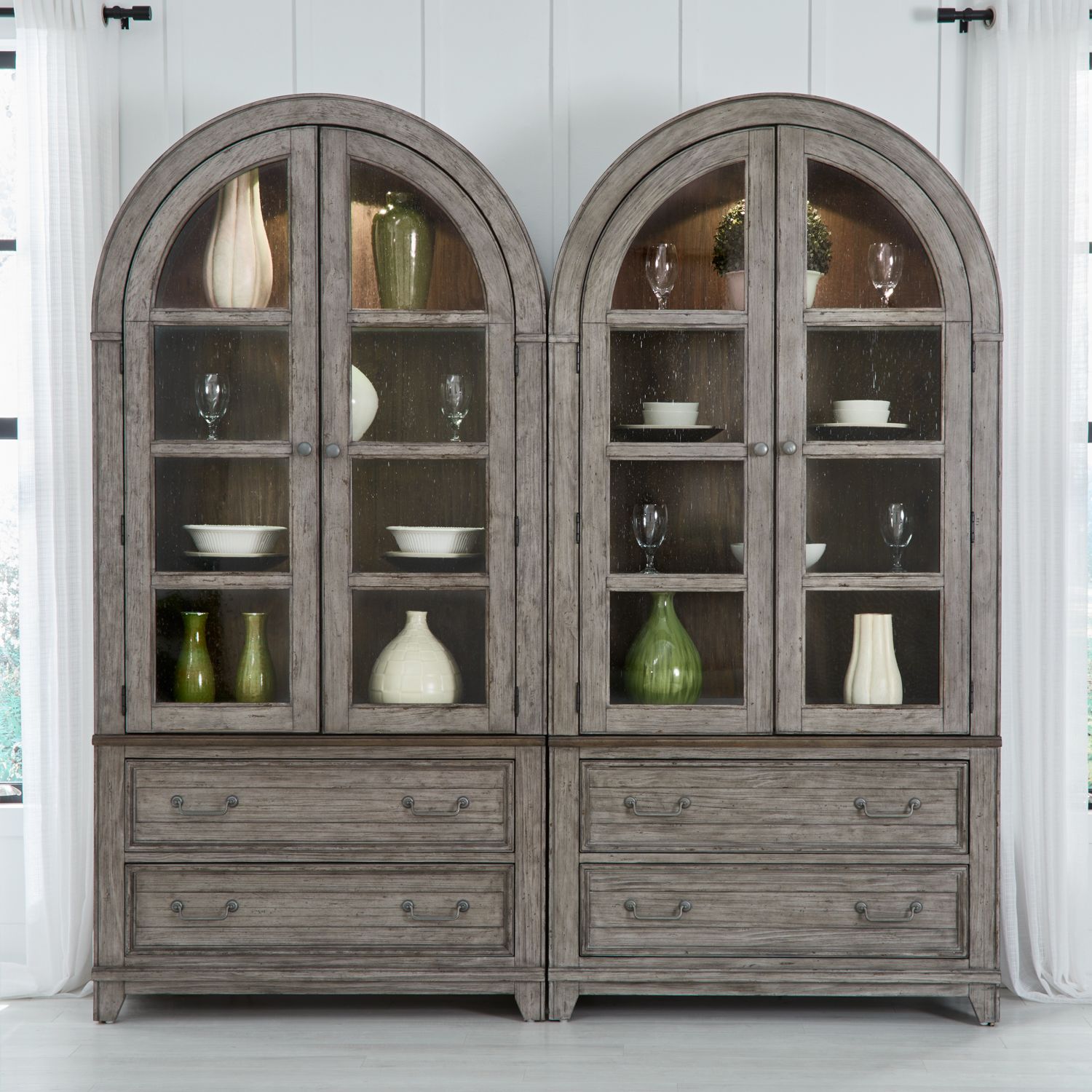 Designed to entice a sense of calm and tranquility into interior spaces, the River Place bunching curio set strikes the perfect balance of life on the coast and a comfy home tucked away in the hills. Crafted with Pine solids and veneers, this set features a heavily distressed Riverstone Grey and Tobacco finish and includes two curio cabinets. The rounded profile is reminiscent of a cathedral arched window. Each cabinet has two wood framed seeded glass doors with wood strip mullions. The doors open to reveal three wood framed adjustable glass shelves with plate grooves, perfect for allowing the touch LED lighting to shine through. The back panel is in the Tobacco finish and pairs well with the Riverstone Grey finish of the case. There are two full extension drawers on each base of the cabinet that offer the elegant touch of soft closing drawer guides. The high-low veneer pattern of the drawer fronts and end panels add dimension. Heavy base molding draws attention to the angled tapered feet. Bunch each cabinet together to create an impressive display. Accented with custom Antique Pewter knob and bail pull hardware, the River Place bunching curio set creates an inviting airy atmosphere in your home while providing comfort in your own private getaway.