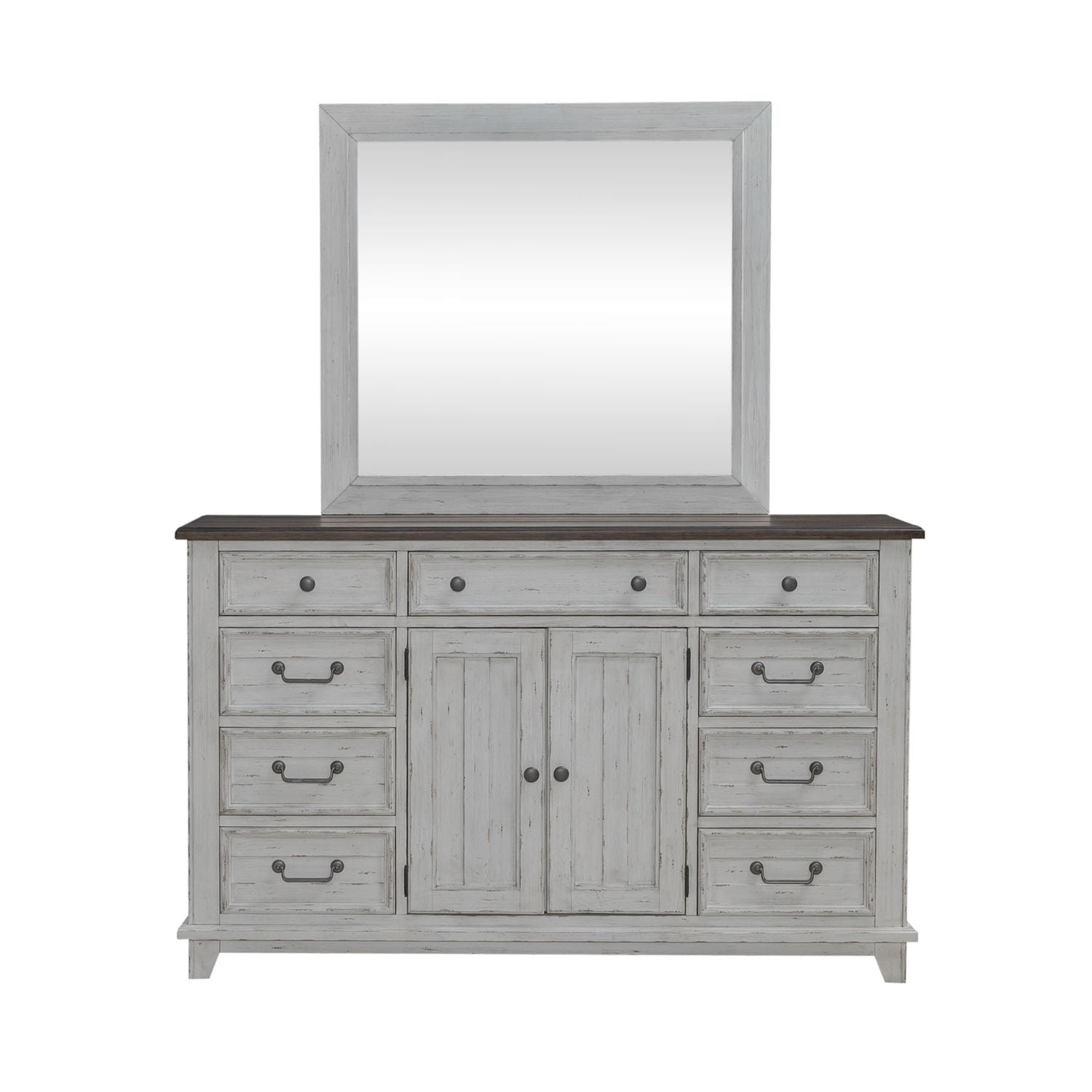 Create a room of your own that provides the perfect start and end to every day with the River Place dresser and mirror. Crafted with excellence using Pine solids and veneers, this set features a heavily distressed two-tone Riverstone White and Tobacco finish. The wood framed drawer and door fronts, along with the framed end panels and top, feature a high-low veneer pattern for textural interest. The drawers feature full extension soft closing drawer guides for an elegant touch with the top drawers offering premium felt lining to protect your valuables, and the bottom drawers with a beautiful cedar panel. One adjustable shelf is located behind the two doors. Wide pilasters flow into angled block feet to complete the farmhouse styling with a timeworn feel that we all know and love. Attach the mirror to the dresser with the included bolt-on supports which features a wide canted frame with mitered corners and a one inch beveled edge for added sparkle. The custom Antique Pewter bail pull and knob hardware accent the River Place 2 door 9 drawer dresser to help create an inviting, airy atmosphere in your home while providing comfort in your own private getaway.