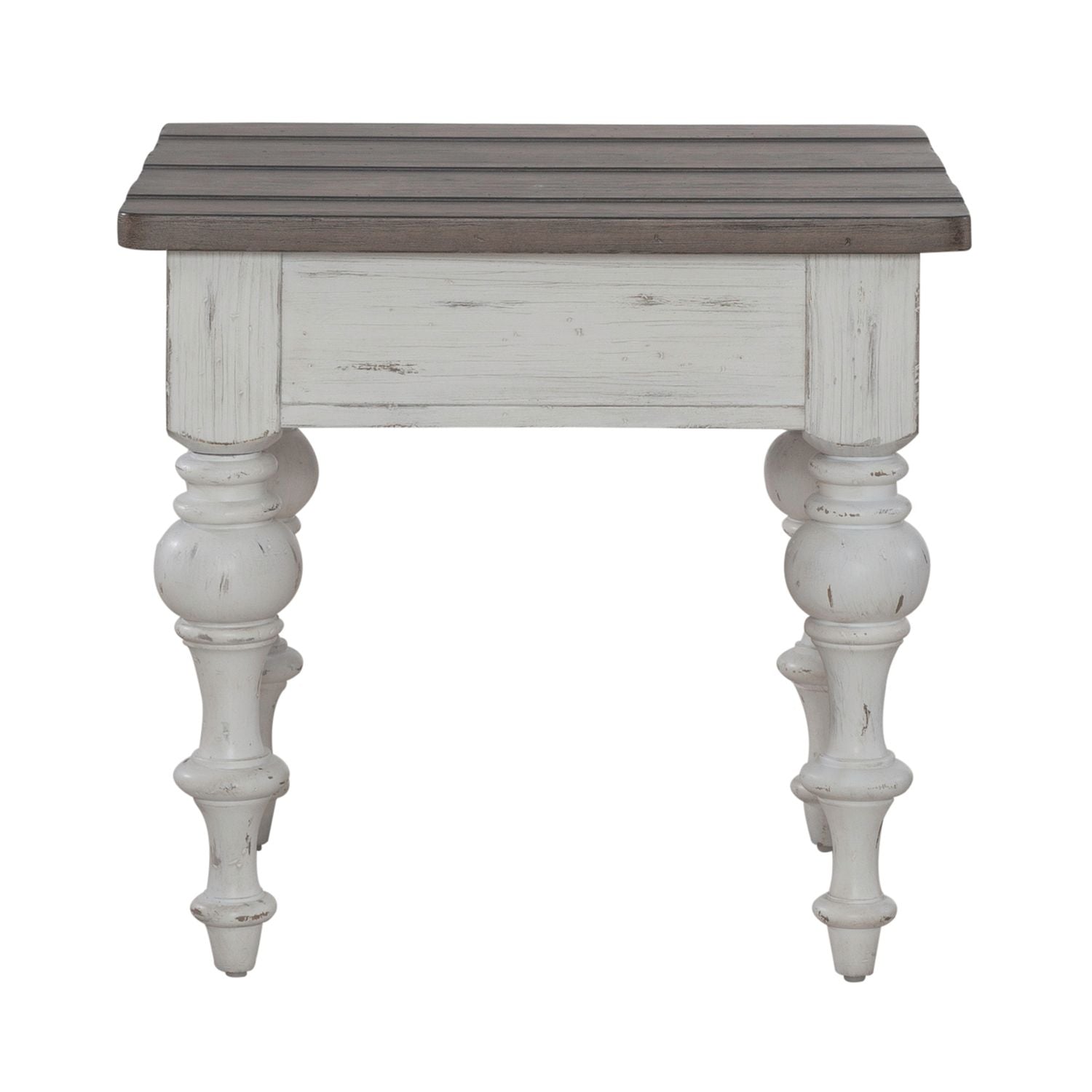 Create a calm and peaceful oasis with the River Place end table. Crafted with Pine solids and veneers, this piece features a heavily distressed two-tone Riverstone White and Tobacco finish. There is one full extension drawer with a wood framed drawer front and bead molding that is accented with Antique Pewter knob hardware. The top features a high-low veneer pattern for textural interest and bodes well with the heavy, multi-turned legs. The River Place end table strikes the perfect balance of life on the coast and a comfy home tucked away in the hills.
