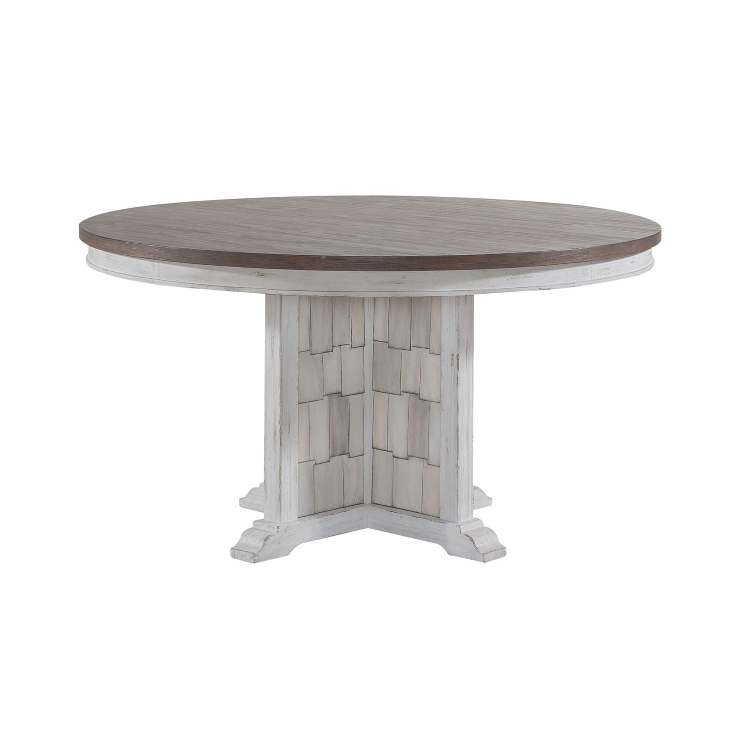 Designed to entice a sense of calm and tranquility into interior spaces, the River Place pedestal table strikes the perfect balance of life on the coast and a comfy home tucked away in the hills. Crafted with Pine solids and veneers, this table features a heavily distressed Riverstone White and Tobacco finish. The fixed tabletop offers bead molding along the apron that draws attention to the pedestal base with shingle accents with color tones of white, gray, and brown that blends effortlessly with the Riverstone White and Tobacco finish for a truly unique look. The River Place pedestal table creates an inviting airy atmosphere in your home while providing comfort in your own private getaway.
