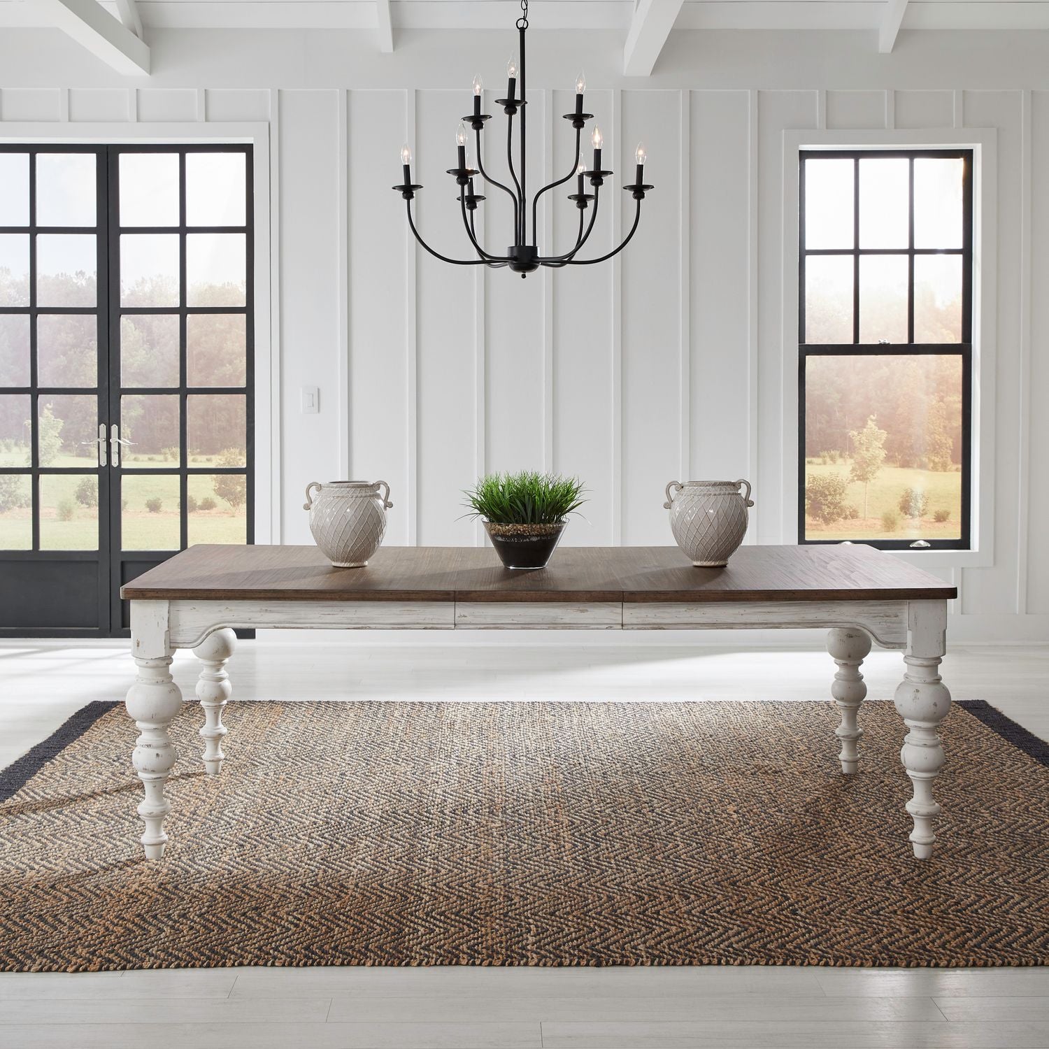 Designed to entice a sense of calm and tranquility into interior spaces, the River Place rectangular leg table strikes the perfect balance of life on the coast and a comfy home tucked away in the hills. Crafted with Pine solids and veneers, this table features a heavily distressed Riverstone White and Tobacco finish. It includes a removable eighteen inch leaf on a wooden guide leaf track system. The table apron has bead molding that flows into shaped ends, drawing attention to the heavy multi-turned legs. The River Place rectangular leg table creates an inviting airy atmosphere in your home while providing comfort in your own private getaway.