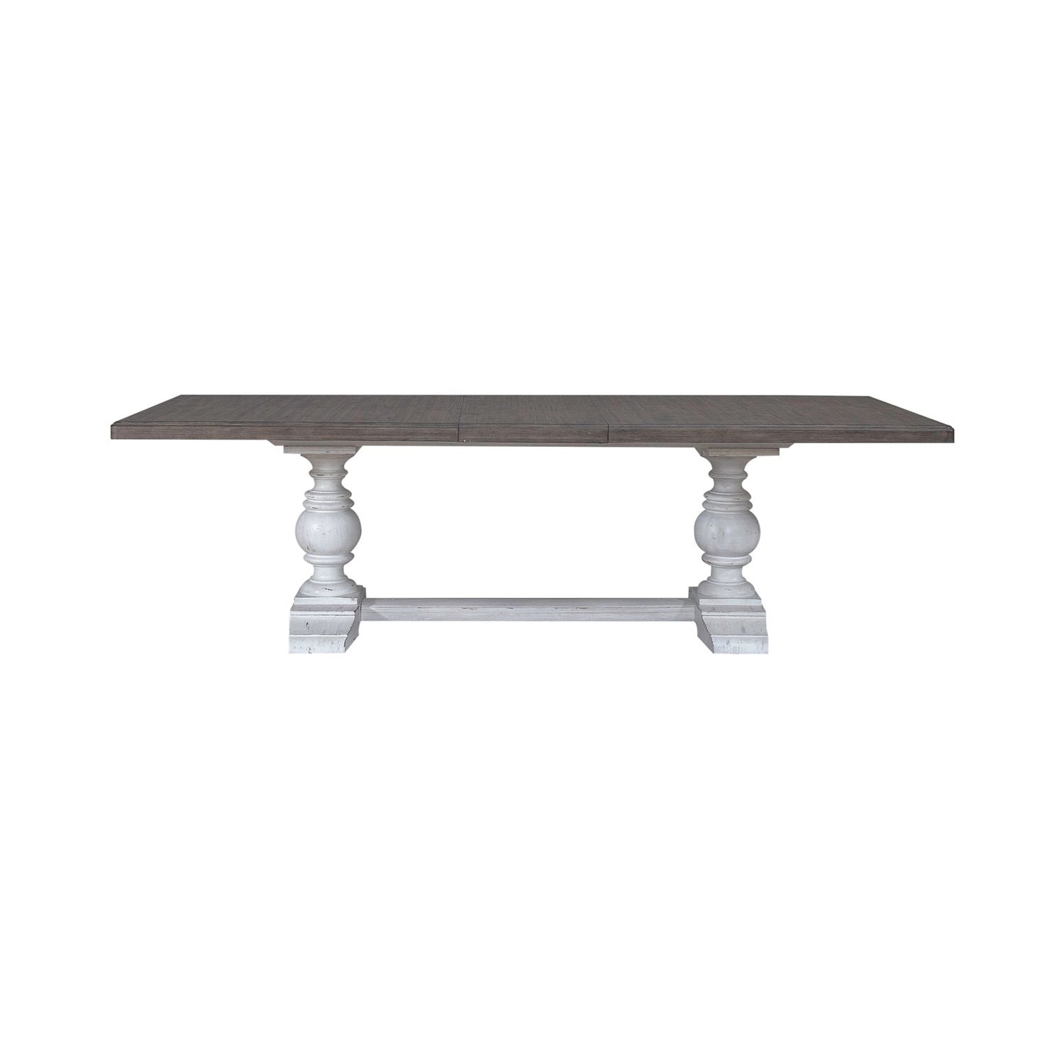 Designed to entice a sense of calm and tranquility into interior spaces, the River Place trestle table strikes the perfect balance of life on the coast and a comfy home tucked away in the hills. Crafted of Pine solids and veneers, this table features a heavily distressed Riverstone White and Tobacco finish. The trestle table includes a removable and self-storing eighteen inch leaf on an easy glide leaf track system to make expansion a breeze. The top offers softly rounded edges with step molding that flow to the heavy turned pedestals with a center trestle to ensure stability. The River Place trestle table creates an inviting airy atmosphere in your home while providing comfort in your own private getaway.