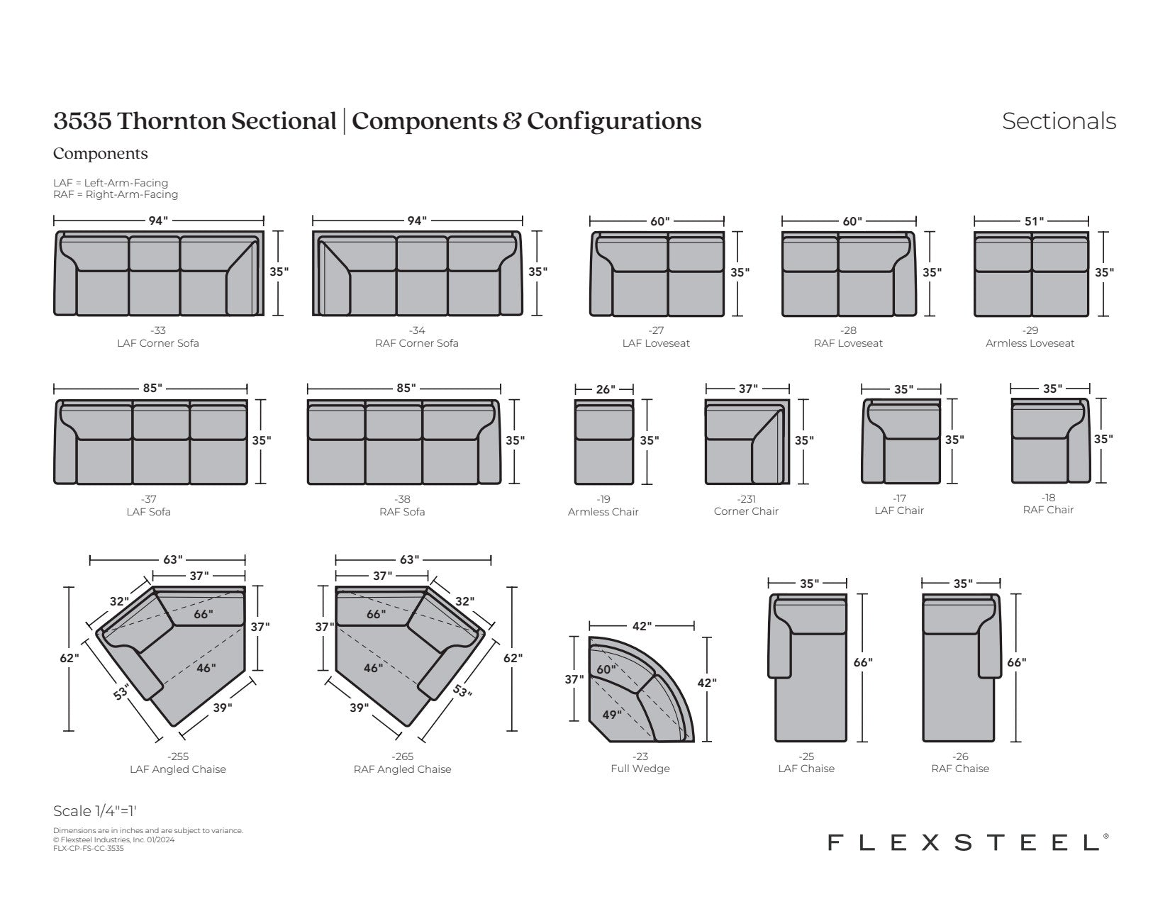 Simple, Classic Tailoring in a Timeless Style Showcase your home with the timeless charm of the Thornton sectional. Smoothly rolled edges and arms, tapered block legs, and a welt-corded trim make it the quintessential living area piece. Offered in a wide range of components and a choice of leather or Kashmira, this sectional provides the style, comfort and creativity for any home – making it one of our long-time best sellers. Sixteen sectional components available to create a custom configuration that fits your space, big or small Transitional style with rolled arms and a welt-corded trim detail Upholstered and expertly tailored in your choice of leather or Kashmira fabric The patented Blue Steel Spring™ seat system provides unmatched support and lasting comfort Sustainably-sourced, kiln-dried wood frame with mortise and tenon joinery for lasting strength and durability High resiliency seat cushions are engineered to maintain their shape over time and are removable for easy cleaning and rotating Fiber-filled, semi-attached back cushions are designed to stay in place for a tidy appearance Square tapered legs are available in three finish options Handcrafted in North America Model Number: 3535-SECT Dimensions