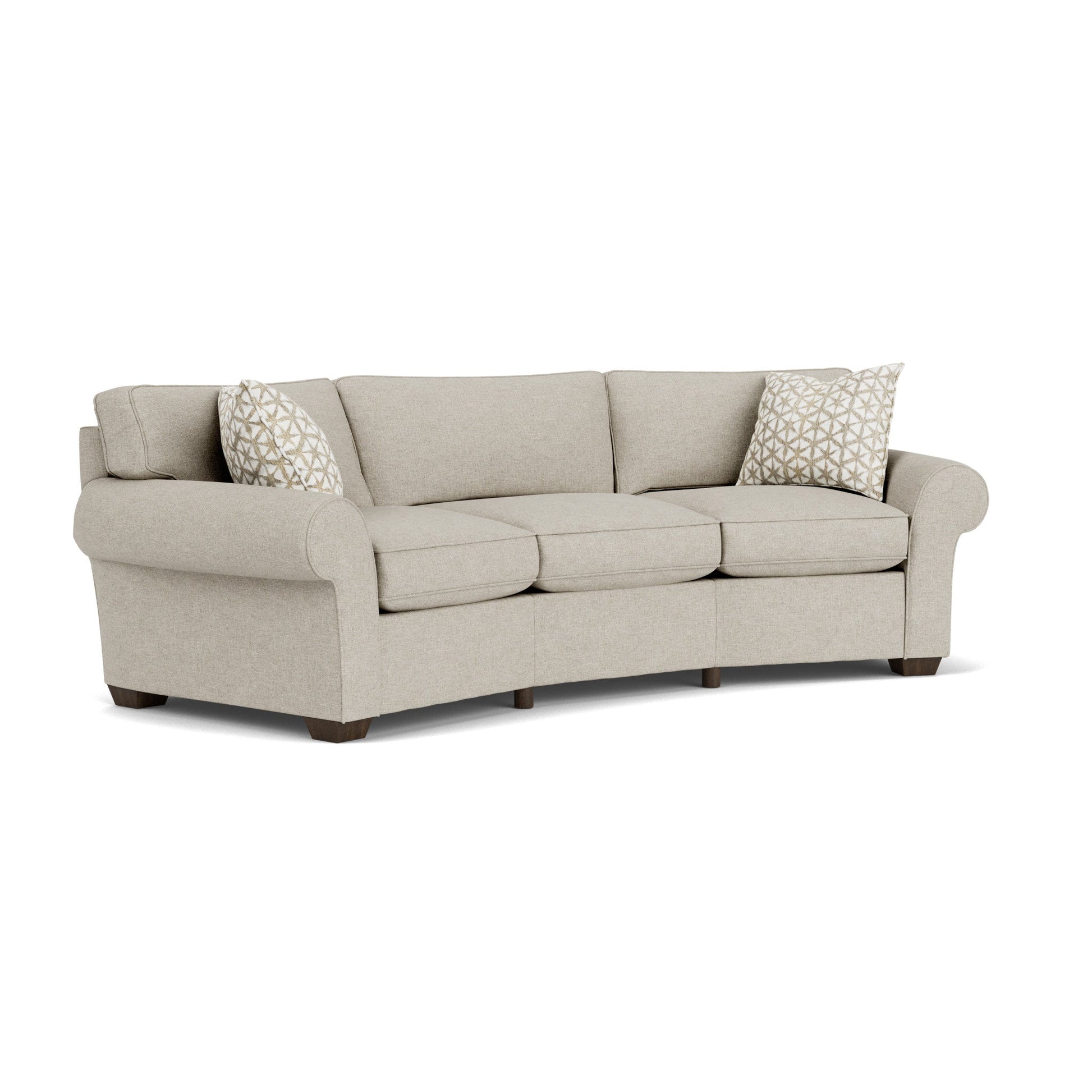 A classic look made for lounging With oversized rolled arms, deep seating, and generous proportions, Vail has everything you need for curled-up coziness. Its slightly flared arms and tall, padded front rail paired with plush cushions trimmed in welt cording make this style ideal for any lounging environment. Dimensions 34H x 107W x 51L