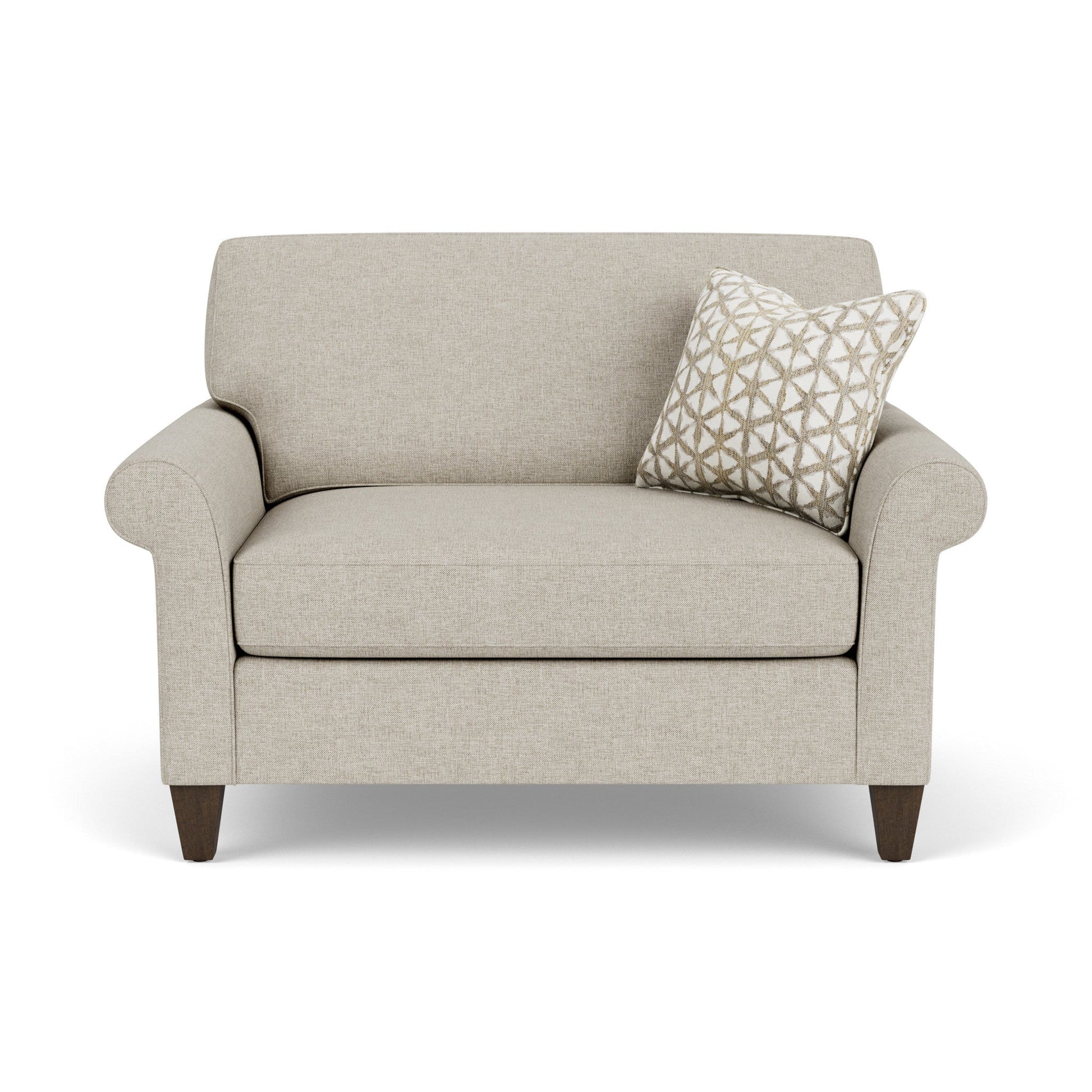 Deep seating with refined style Lean back and look sophisticated in this Westside classic. Rolled arms and tapered wooden legs elevate an angled profile so you can sit back and relax elegantly. Soft boxed seat and back cushions paired with quality construction provide years of comfortable seating for you and your family. Dimensions 37H x 52W x 37L